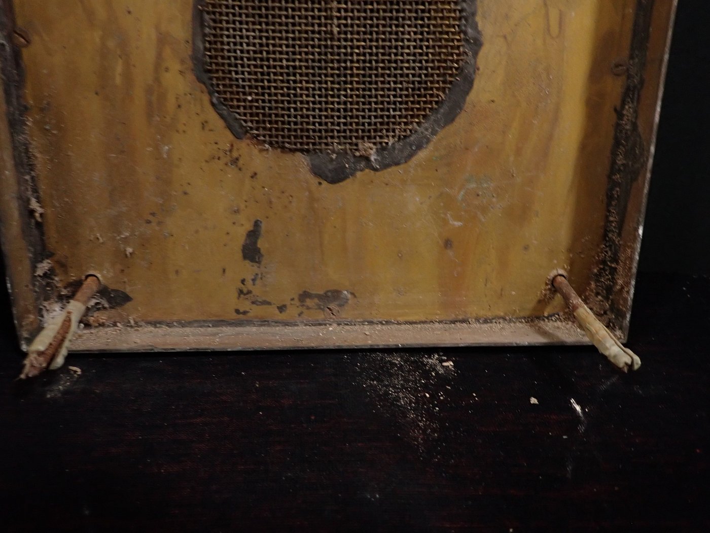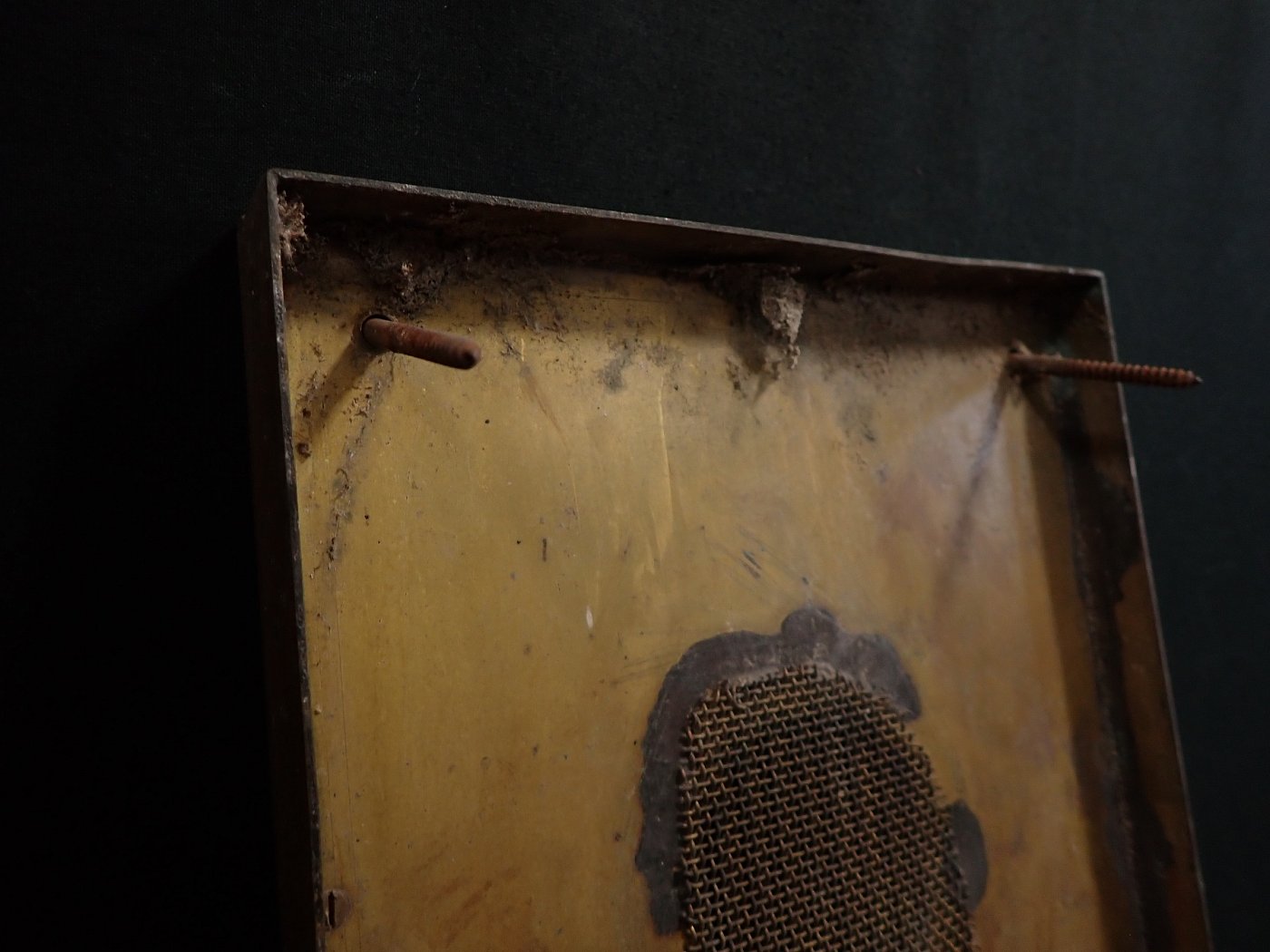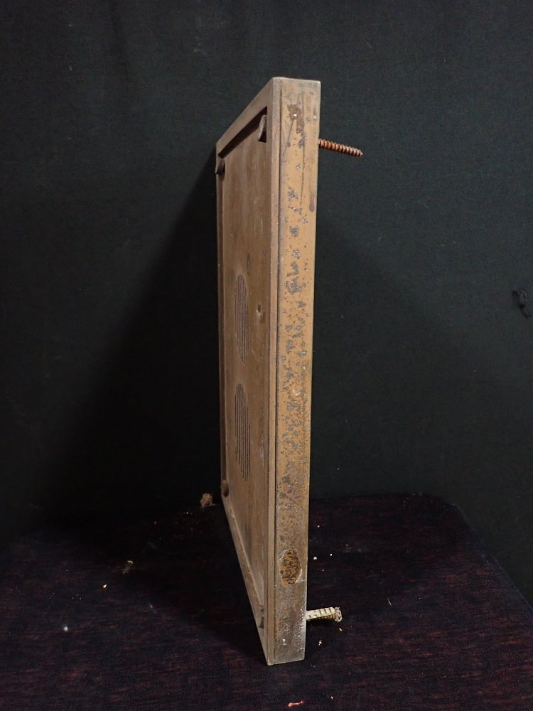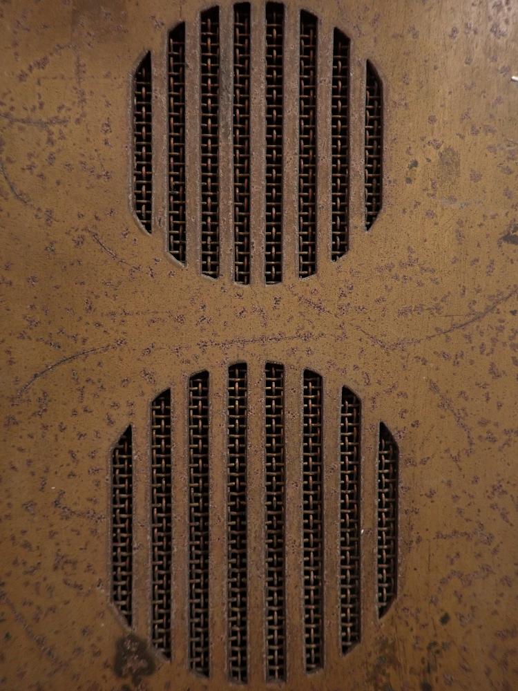 Die Sprechanlagen Abdeckung besteht aus Messing und wird mit vier Schrauben an der Wand befestigt. Auf der Oberfläche sind angelaufene Stellen und abnutzungsstellen...
