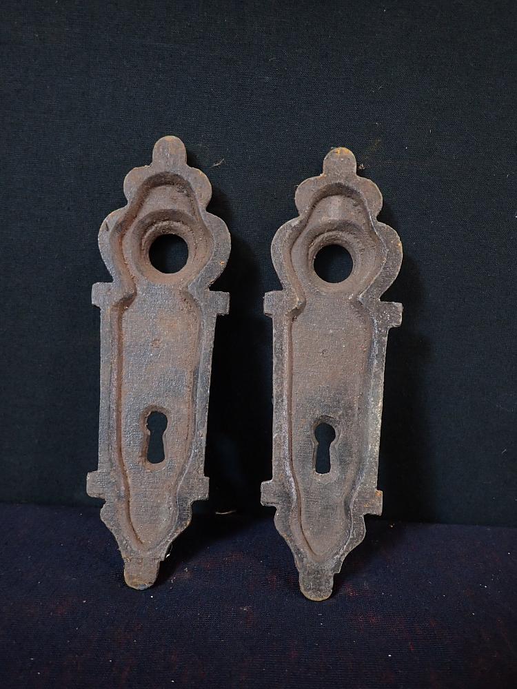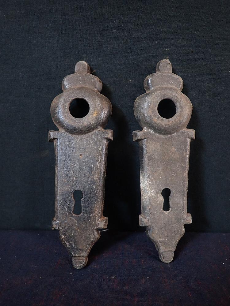 DetailansichtHistorisches Schlüsselschildpaar. Das geschmiedete Schlossschildpaar hat eine schöne, rostige Patina. Form und Verzierung erinnern an florale Elemente. Sicherlich...