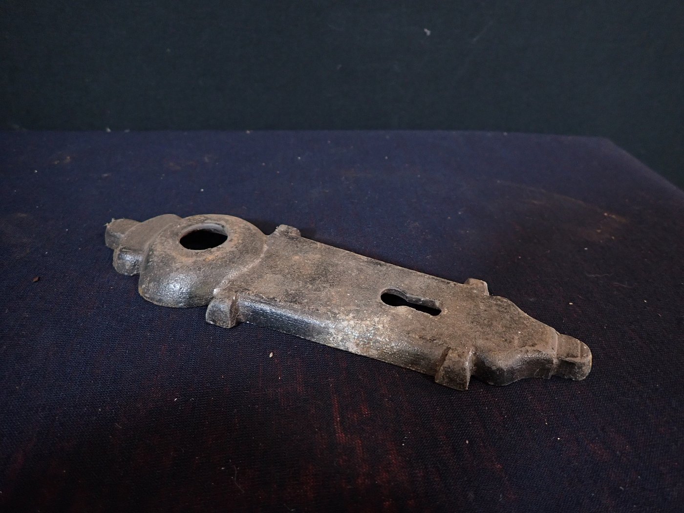 DetailansichtHistorisches Schlüsselschildpaar. Das Schlossschildpaar ist aus Blech gestanzt und hat eine schöne, rostige Patina. Form und Verzierung erinnern an florale Elemente. Sicherlich...