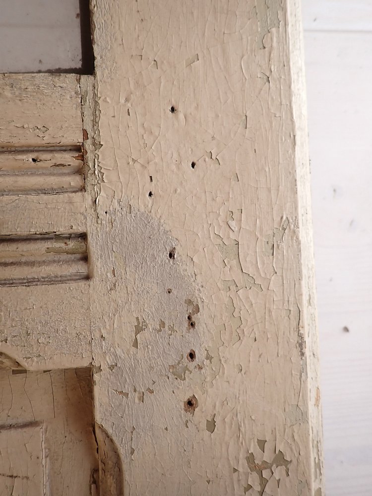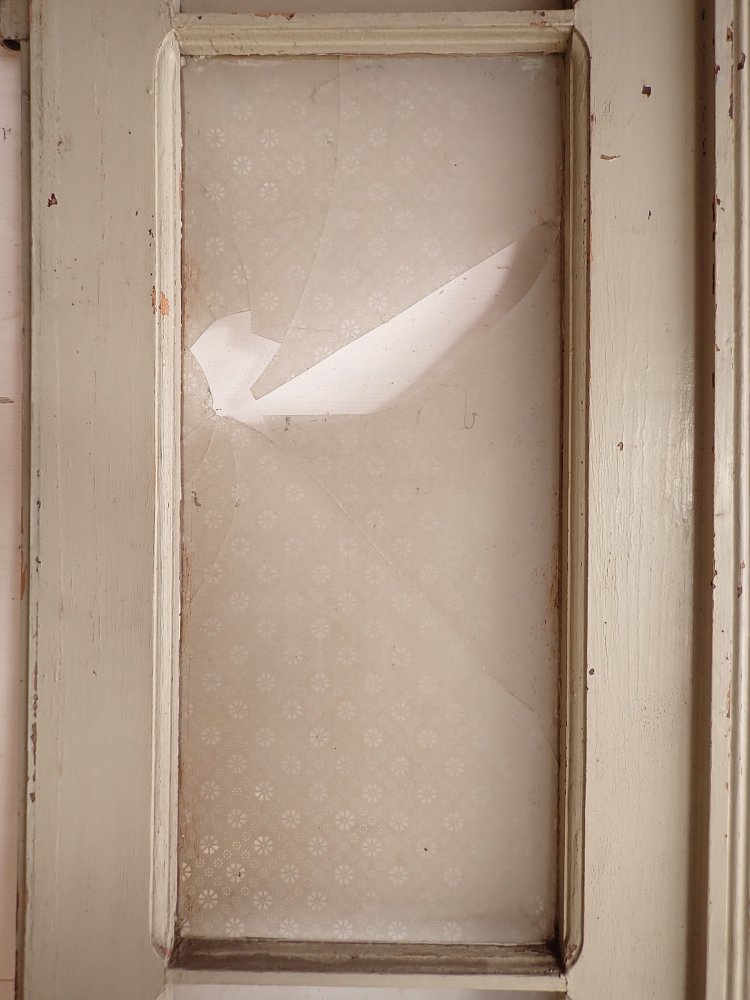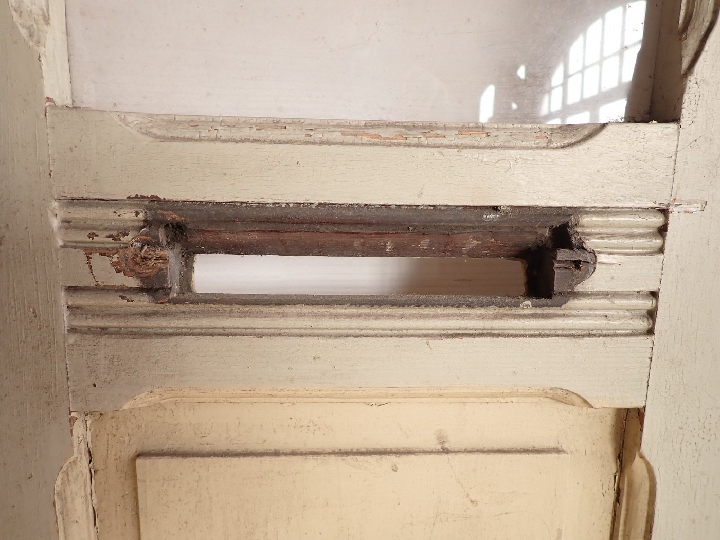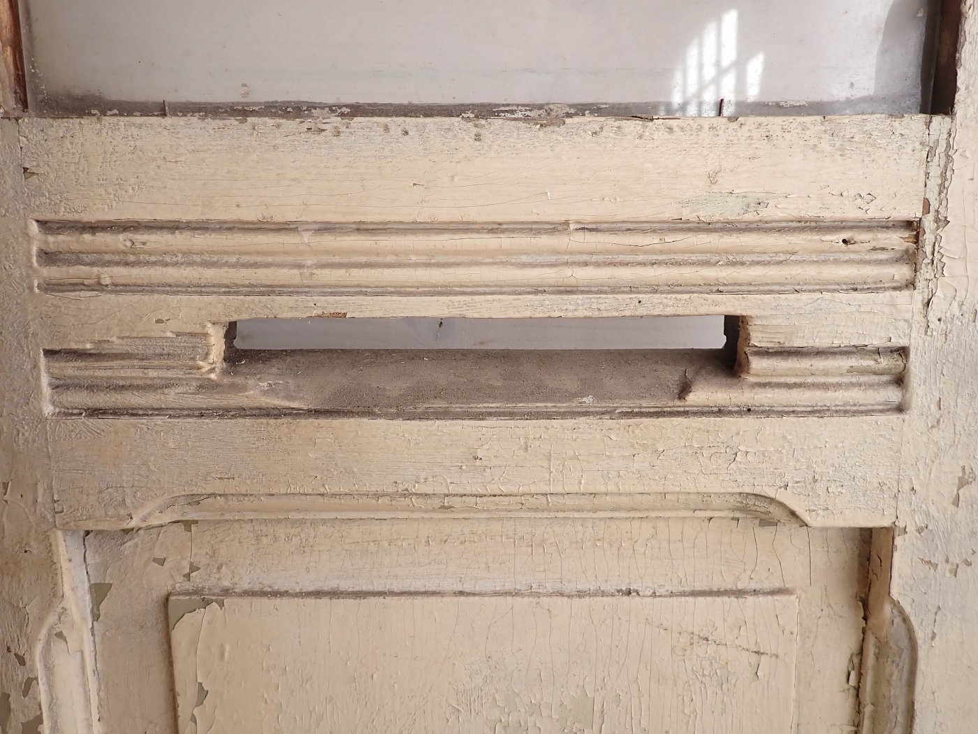 Die Tür befindet sich in einem altersbedingten Gebrauchszustand. Der Lack blättert ab, der Briefschlitz hat keine Abdeckung und die Fugen der Scheibe sind bereits spröde und abgebrochen.