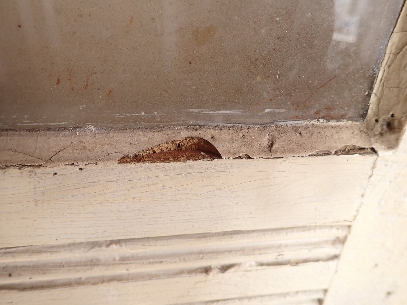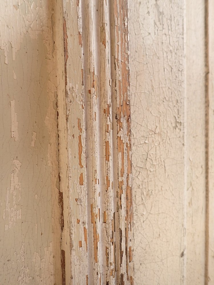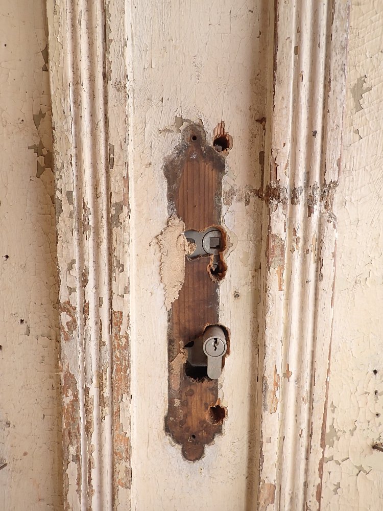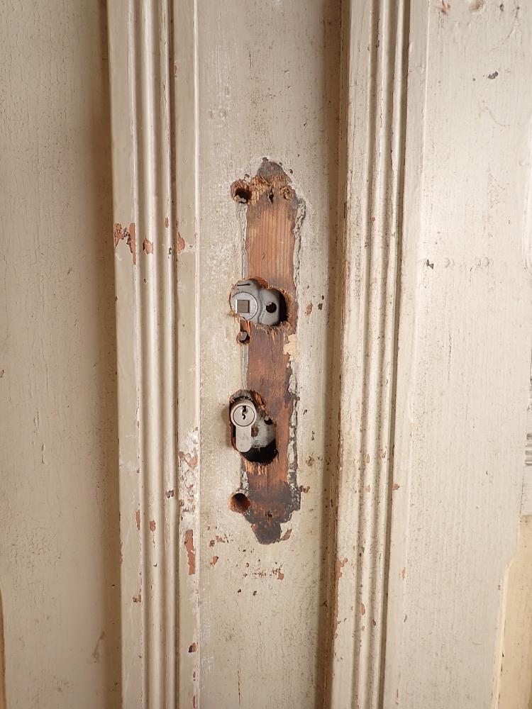 Die Tür befindet sich in einem altersbedingten Gebrauchszustand. Der Lack blättert ab, der Briefschlitz hat keine Abdeckung und die Fugen der Scheibe sind bereits spröde und abgebrochen.