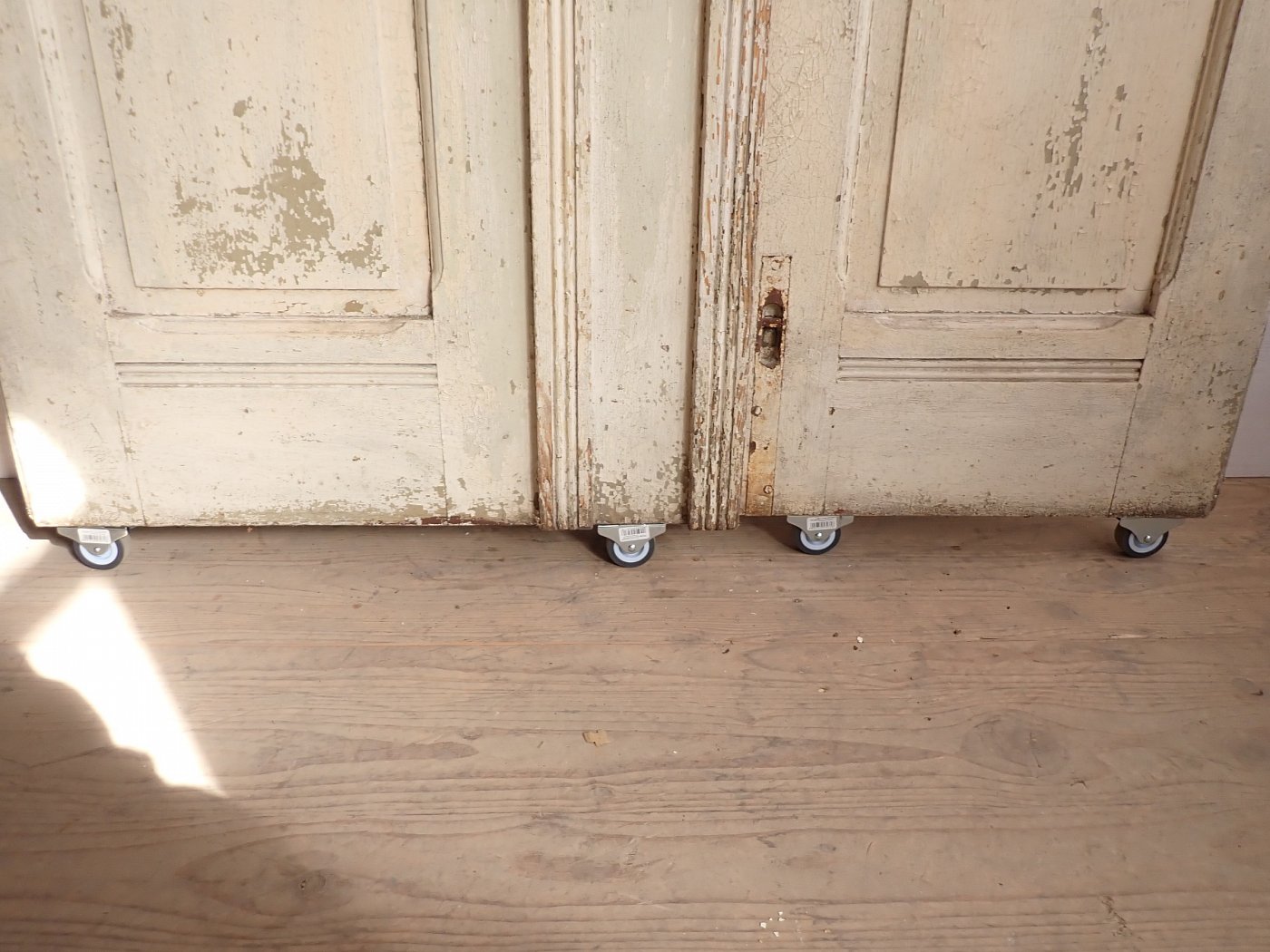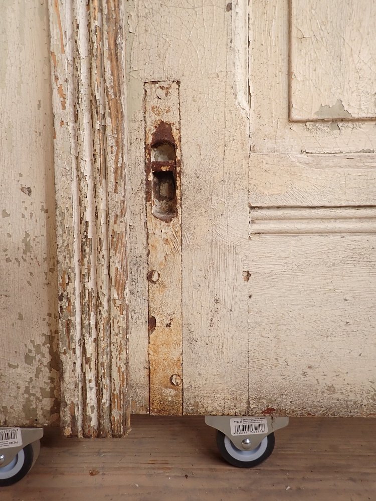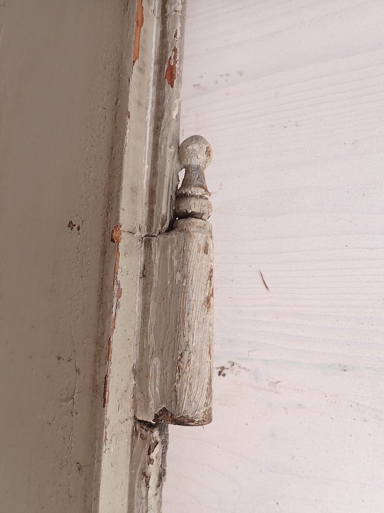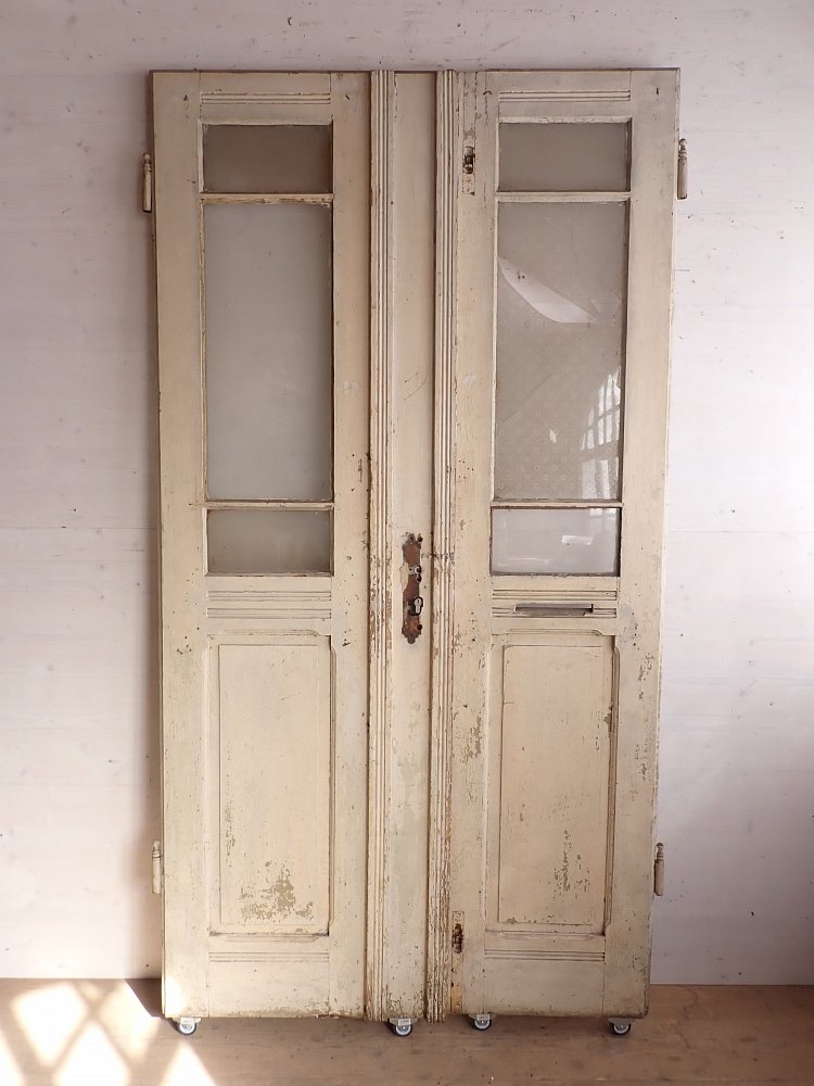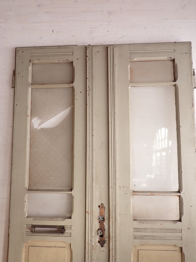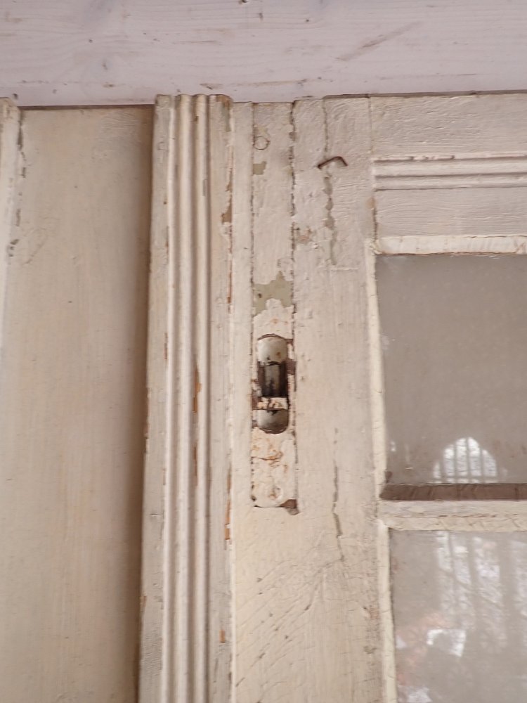 Die 1,5 flügelige Wohnungstür ist aus Weichholz gefertigt und dekorativ mit Glasfüllungen und verzierten Holzfüllungen gestaltet. Die Scheiben sind größtenteils mit Klarglas und eine mit Muster, die allerdings einen Sprung und fehlende Teile hat. Die Tür ist mit einem Schloss ausgestattet, aber die Klinken fehlen. Da lässt sich bestimmt etwas Passendes in unserem Türzubehör finden.