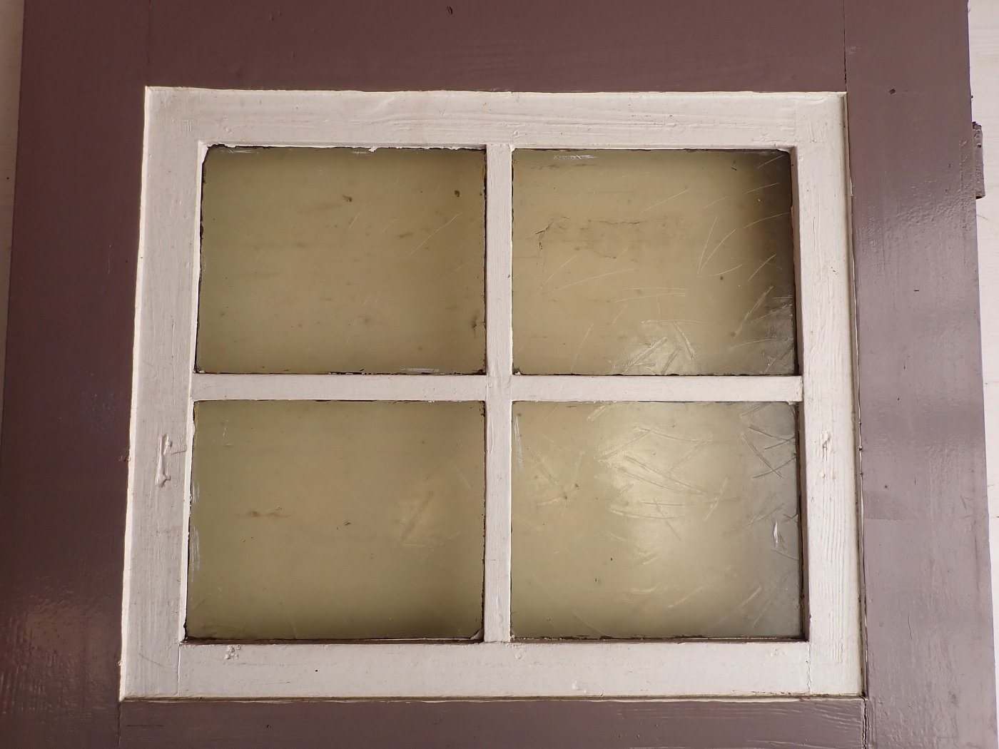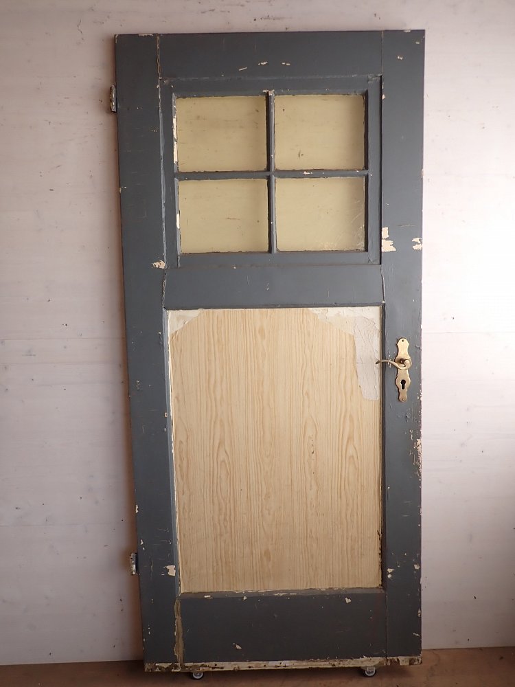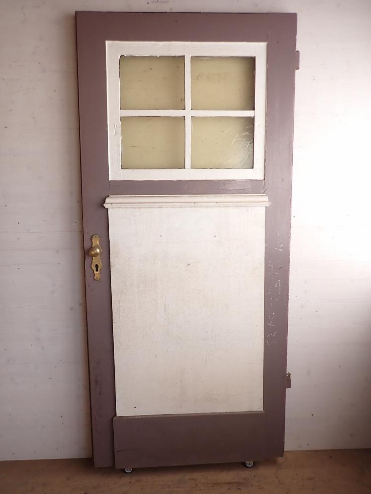 Wohnungstür aus Weichholz mit Fenstereinsatz.