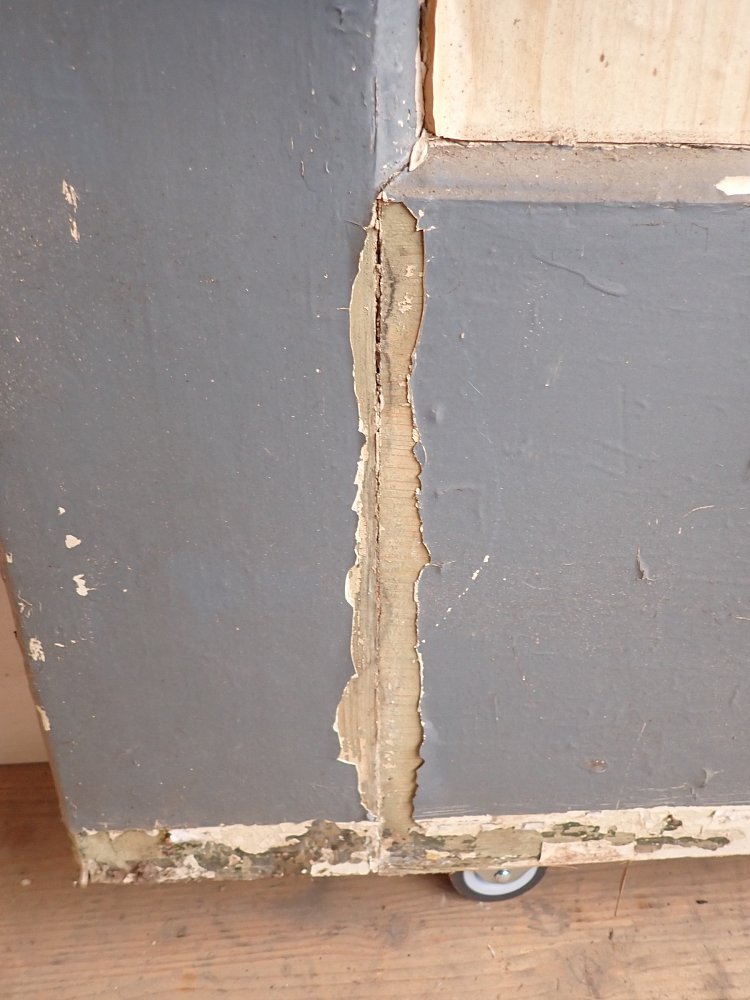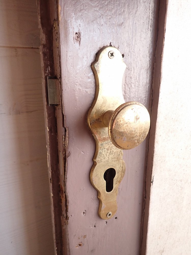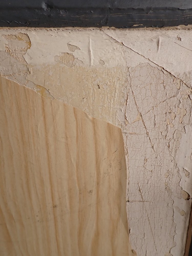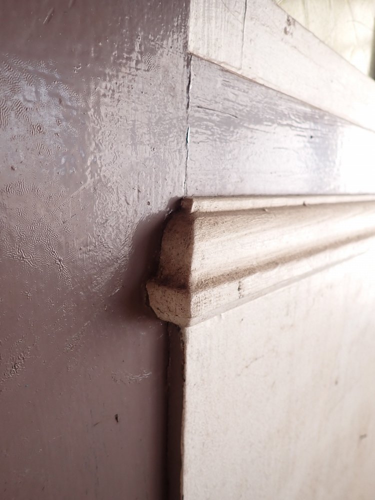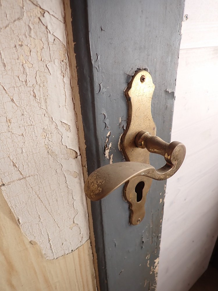 Vor einem Wiedereinbau braucht die Tür auf jeden Fall noch einige Zuwendung, denn im Laufe der Jahre hat sie die unterschiedlichsten Farbschichten aufgetragen bekommen. Zuletzt dann sogar noch eine Klebefolie auf der Kassettenfüllung.