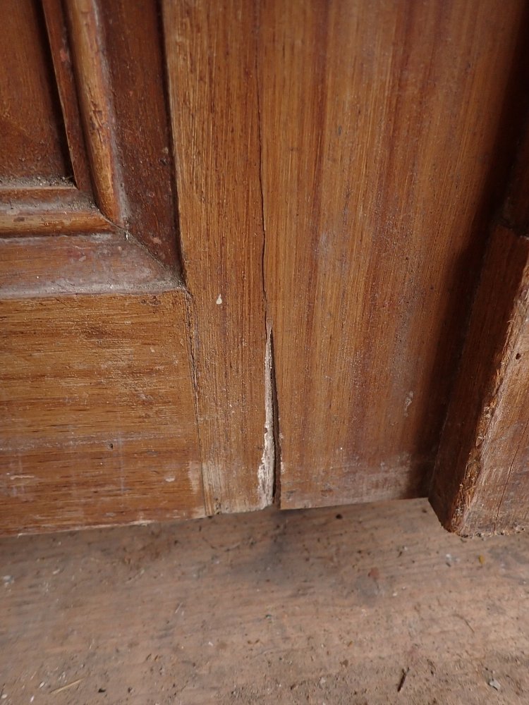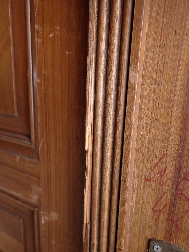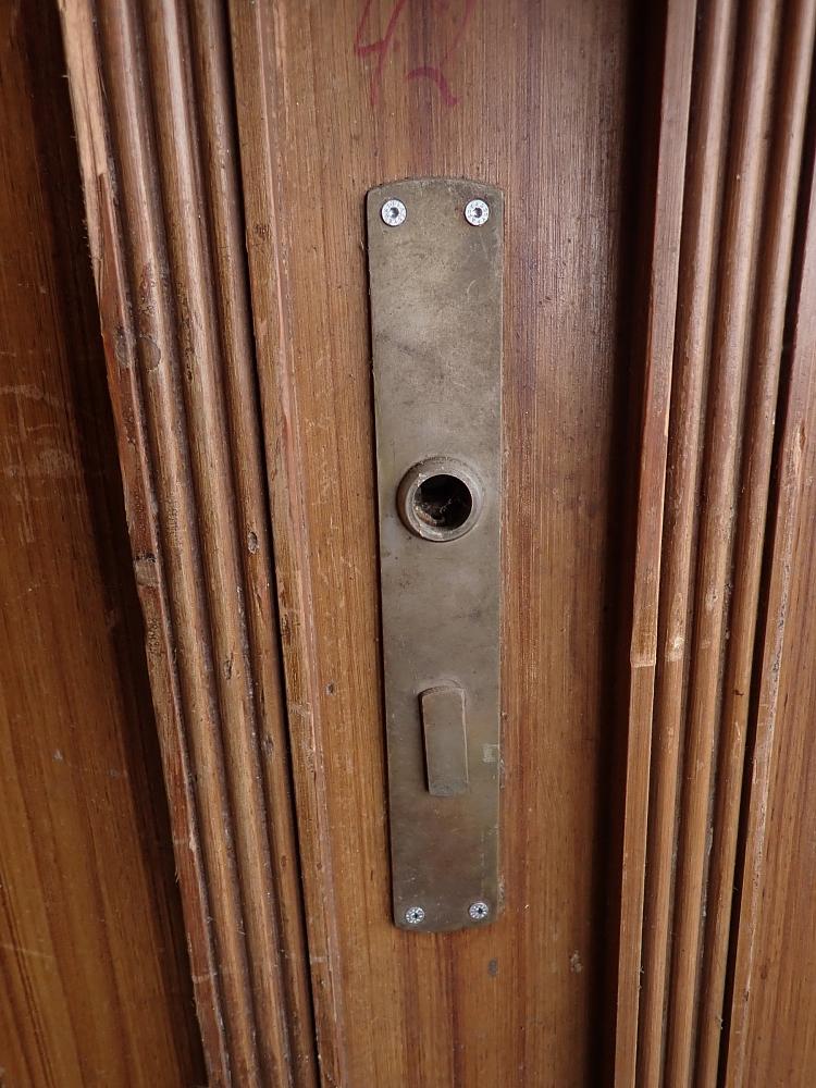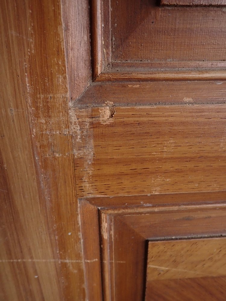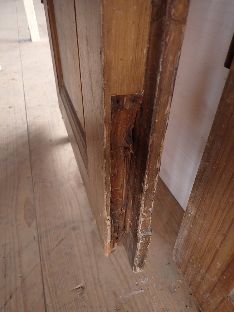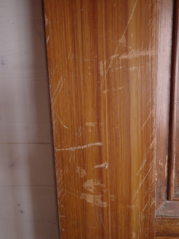 Auch wenn die Grundsubstanz der Tür solide und gut ist, braucht sie vor einem Wiedereinbau noch einige Stunden Zuwendung, denn die Oberflächen haben im Laufe der Jahre, der mehrfachen Besitzerwechsel sowie Transporte und Lagerungen einige Schrammen bekommen.