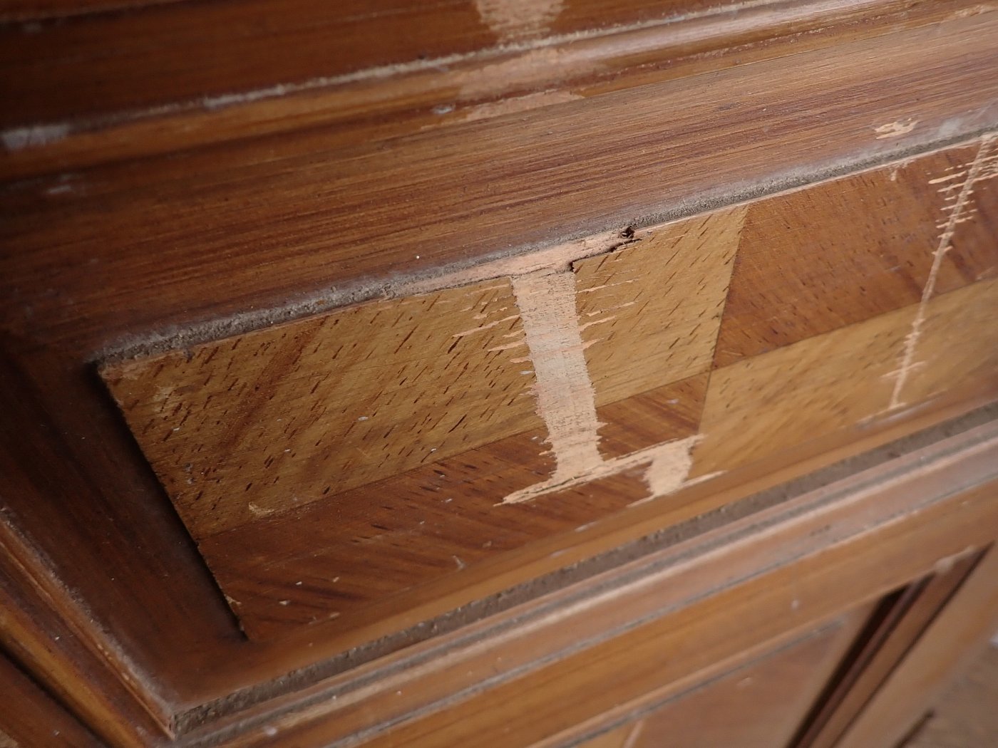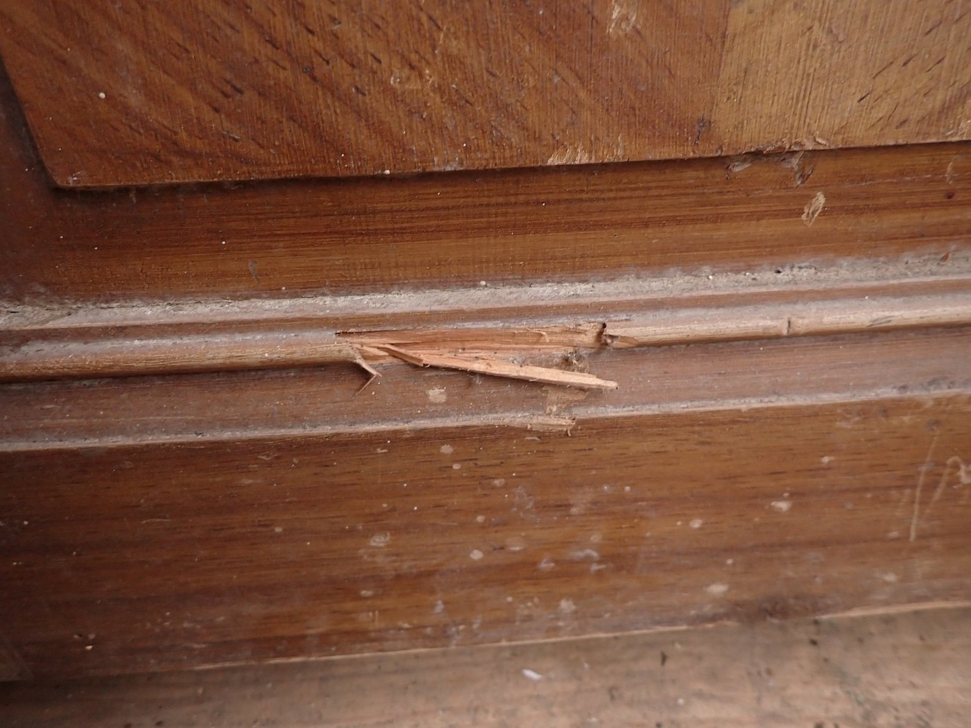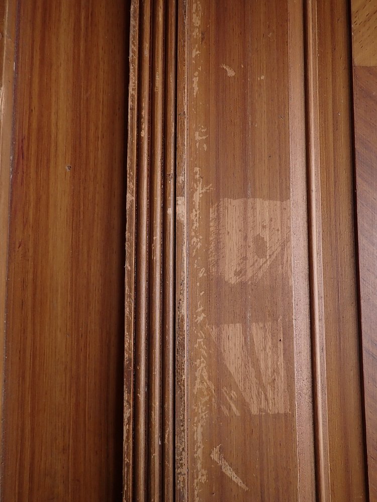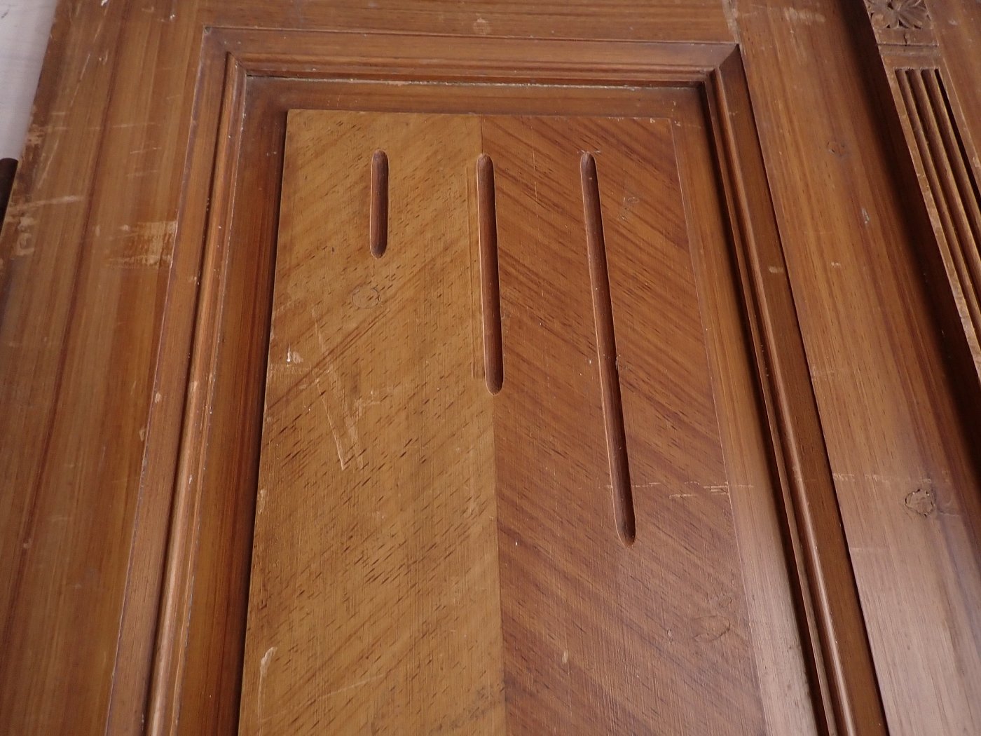 Auch wenn die Grundsubstanz der Tür solide und gut ist, braucht sie vor einem Wiedereinbau noch einige Stunden Zuwendung, denn die Oberflächen haben im Laufe der Jahre, der mehrfachen Besitzerwechsel sowie Transporte und Lagerungen einige Schrammen bekommen.