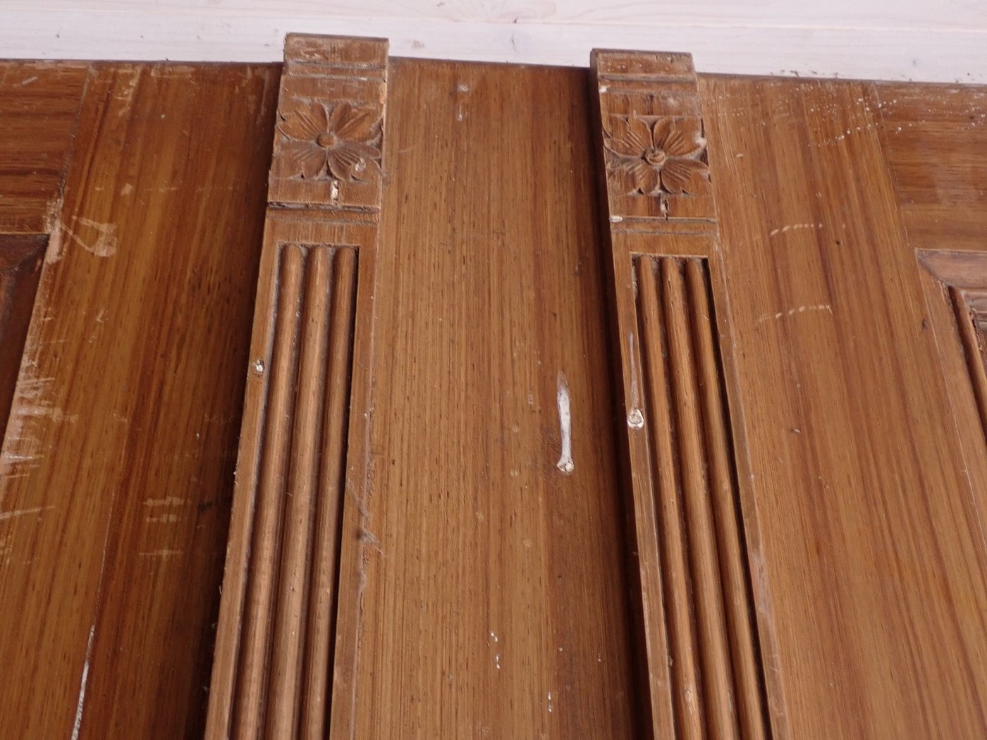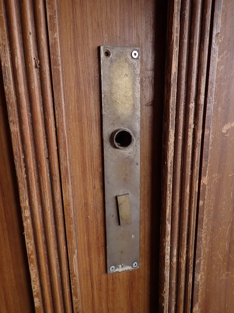 Die hohe Tür ist sowohl auf der Außen- als auch auf der Innenseite lackiert, was den Eindruck erweckt als wäre die Tür in zwei unterschiedlichen Farbtönen und in geometrischer Anordnung mit Furnier belegt. Als Schlagleiste und symmetrisches Pendant sind schmale, kannelierte Pilaster aufgebracht, welche oben mit kleinen geschnitzten Blüten verziert sind.