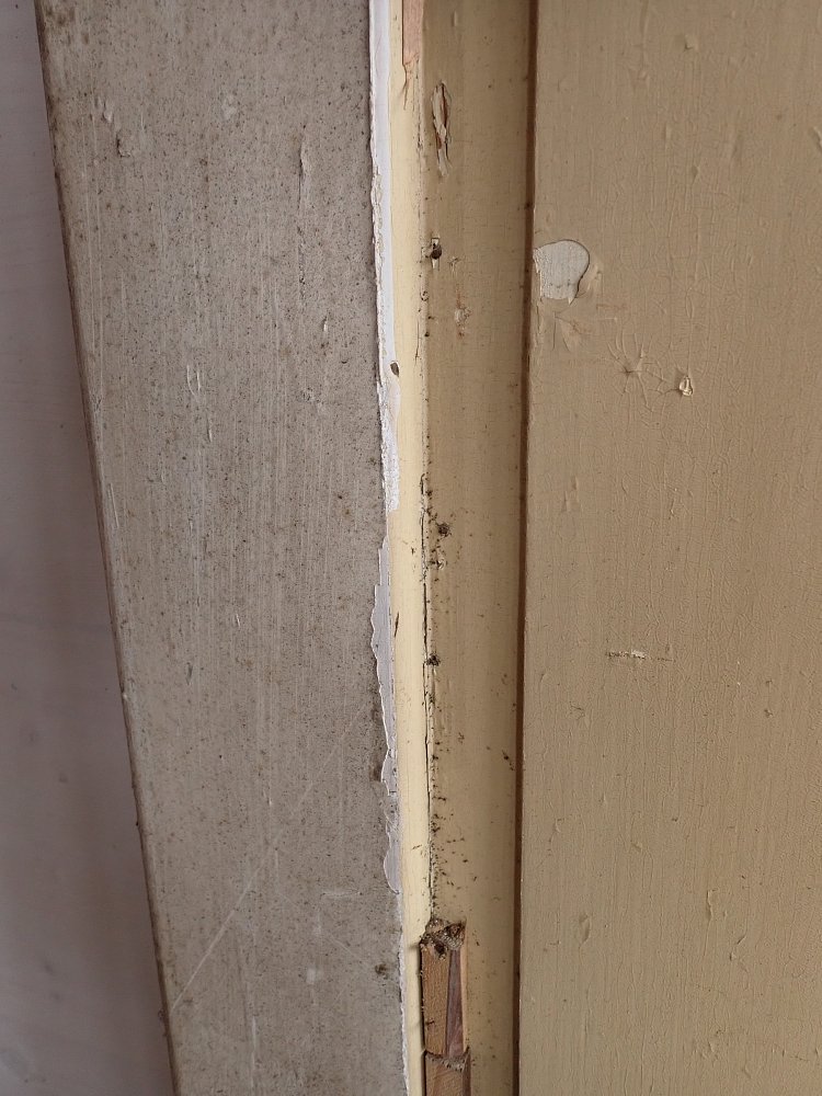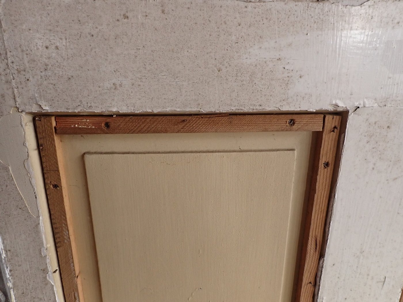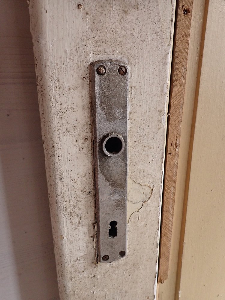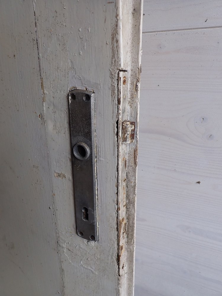 Ansonsten befindet sich die Tür in einem soliden Bergezustand und braucht lediglich die eine oder andere optische Auffrischung. So sind auf der Türinnenseite in den Kassettenfüllungen noch kleine Holzleisten angebracht. Hier waren vermutlich einmal Holzplatten aufgenagelt um für zusätzliche Dämmung zu sorgen. Evtl. befinden sich sogar unter den anderen "glatten Füllungen" noch die originalen, abgeplatteten Füllungen.