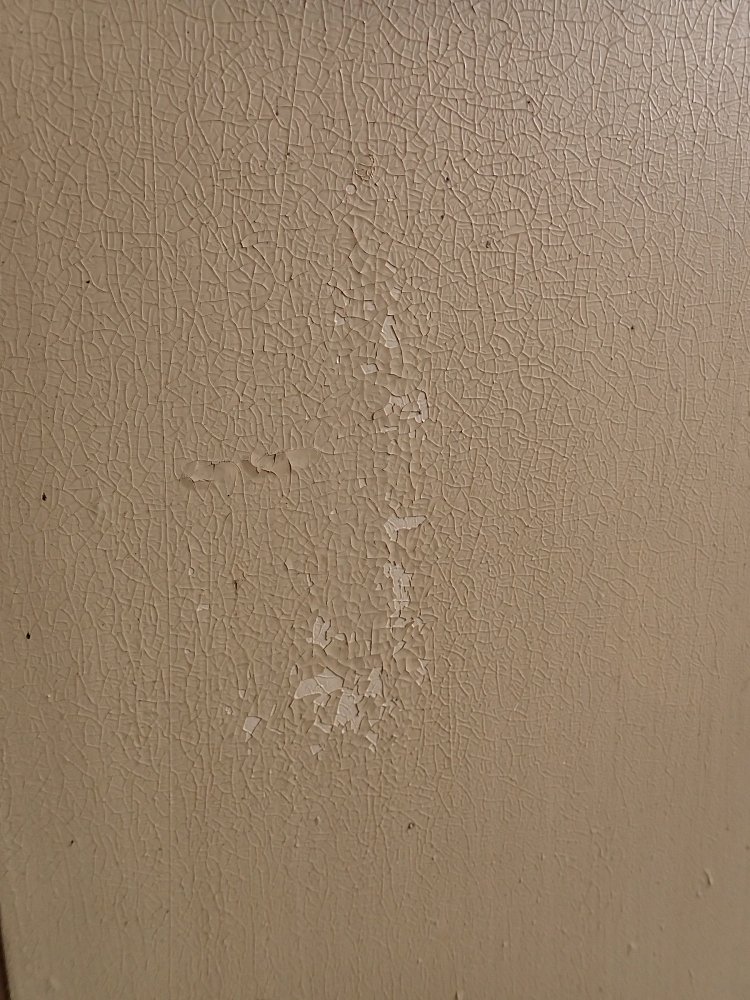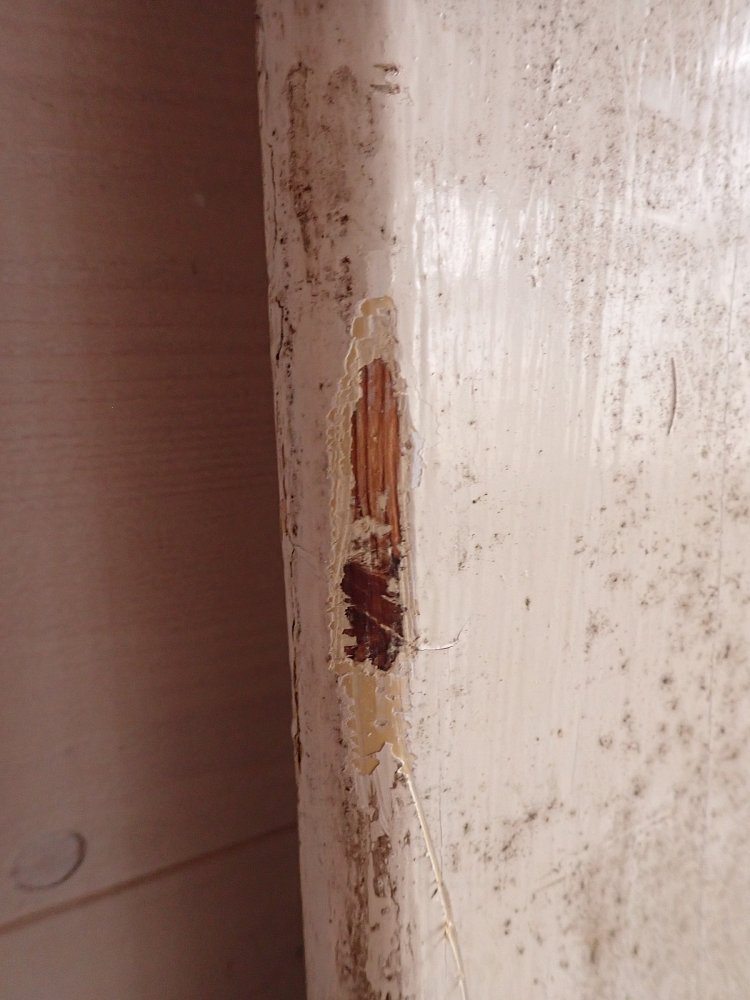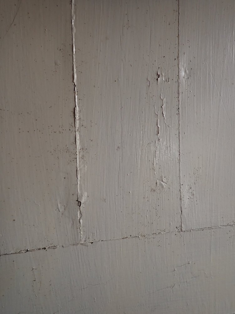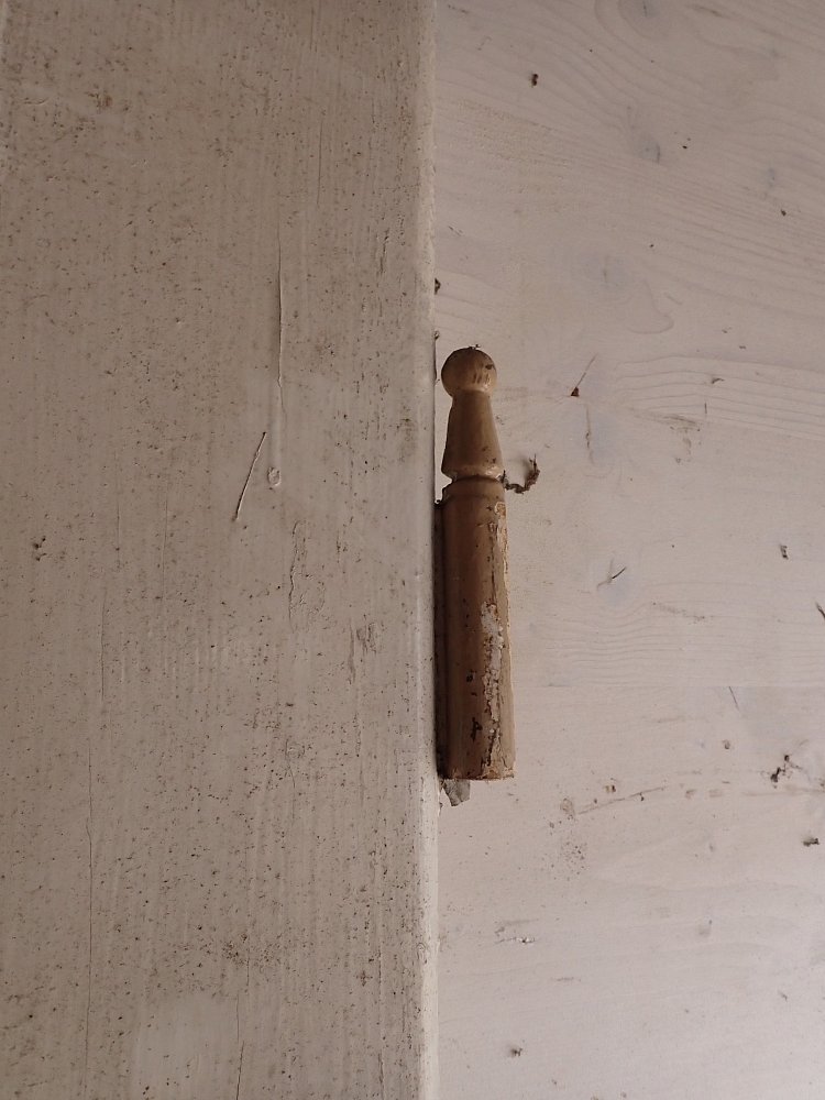 Ansonsten befindet sich die Tür in einem soliden Bergezustand und braucht lediglich die eine oder andere optische Auffrischung. So sind auf der Türinnenseite in den Kassettenfüllungen noch kleine Holzleisten angebracht. Hier waren vermutlich einmal Holzplatten aufgenagelt um für zusätzliche Dämmung zu sorgen. Evtl. befinden sich sogar unter den anderen "glatten Füllungen" noch die originalen, abgeplatteten Füllungen.