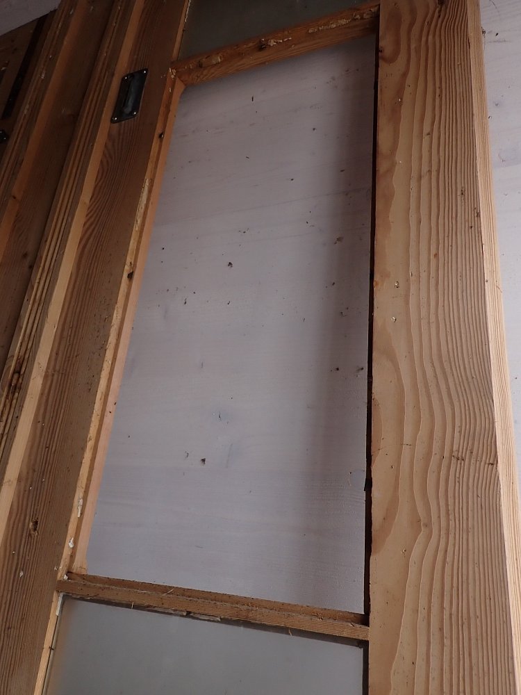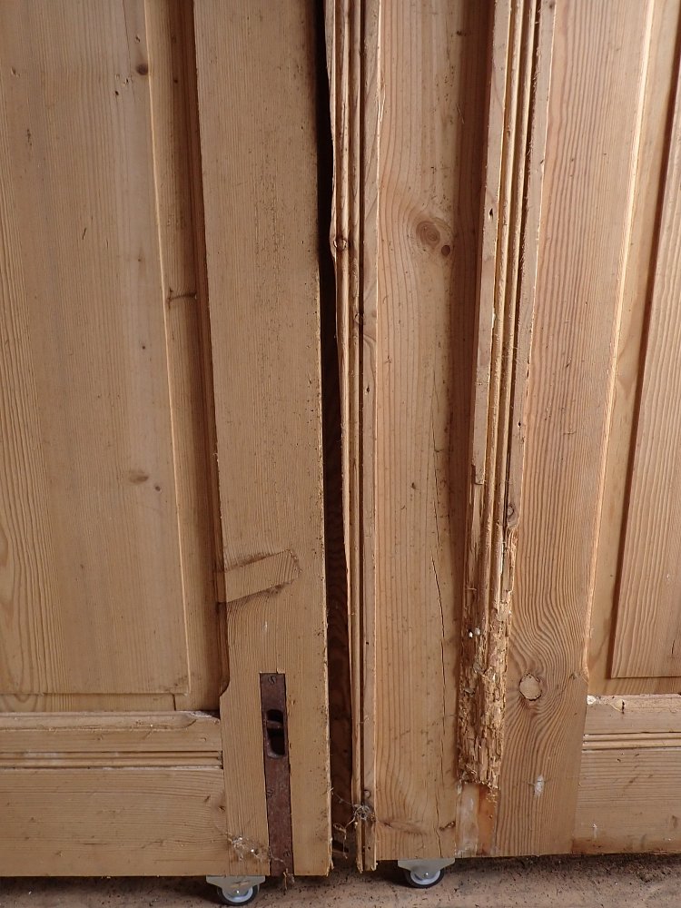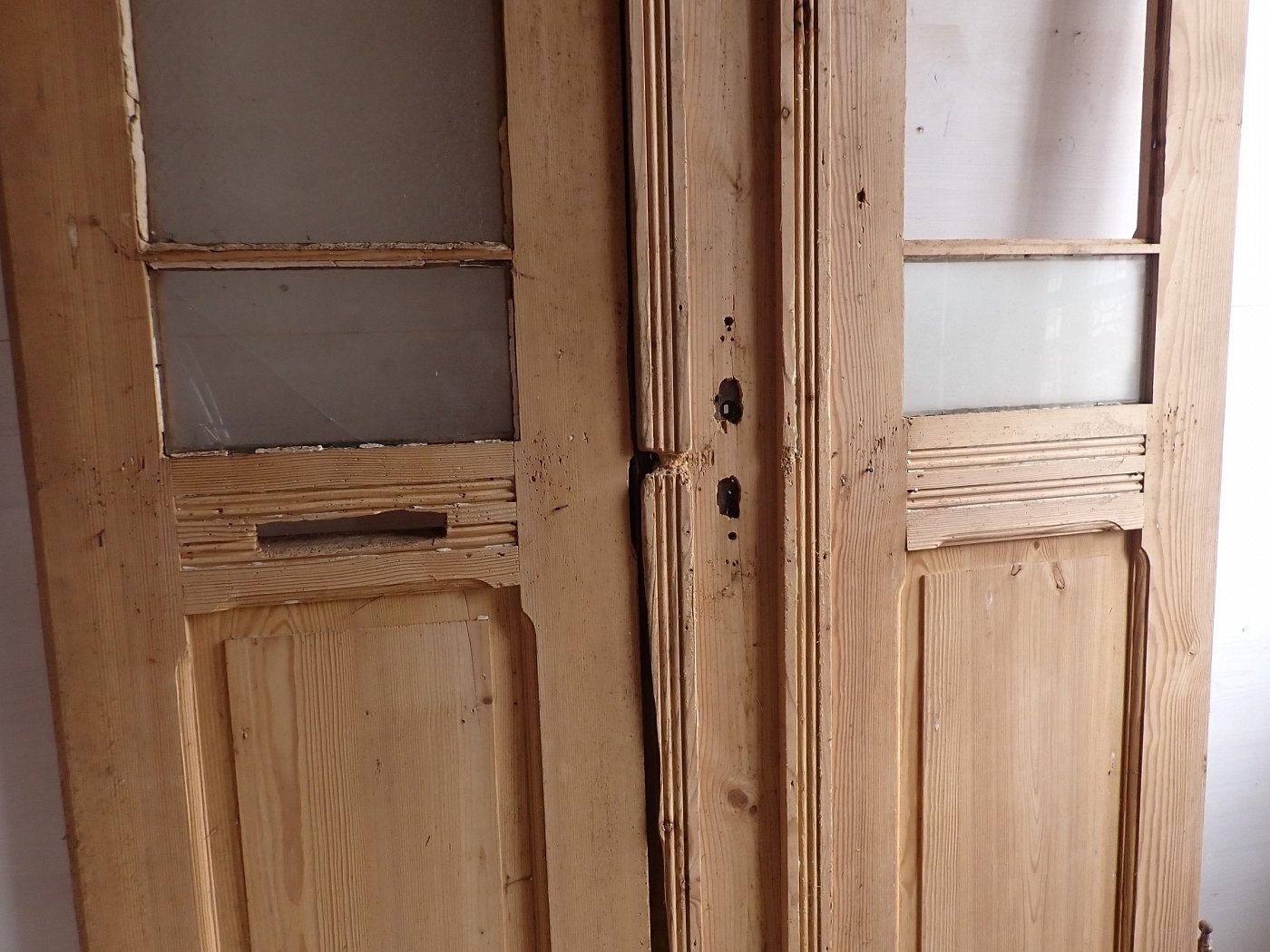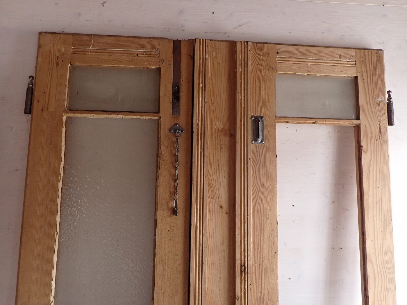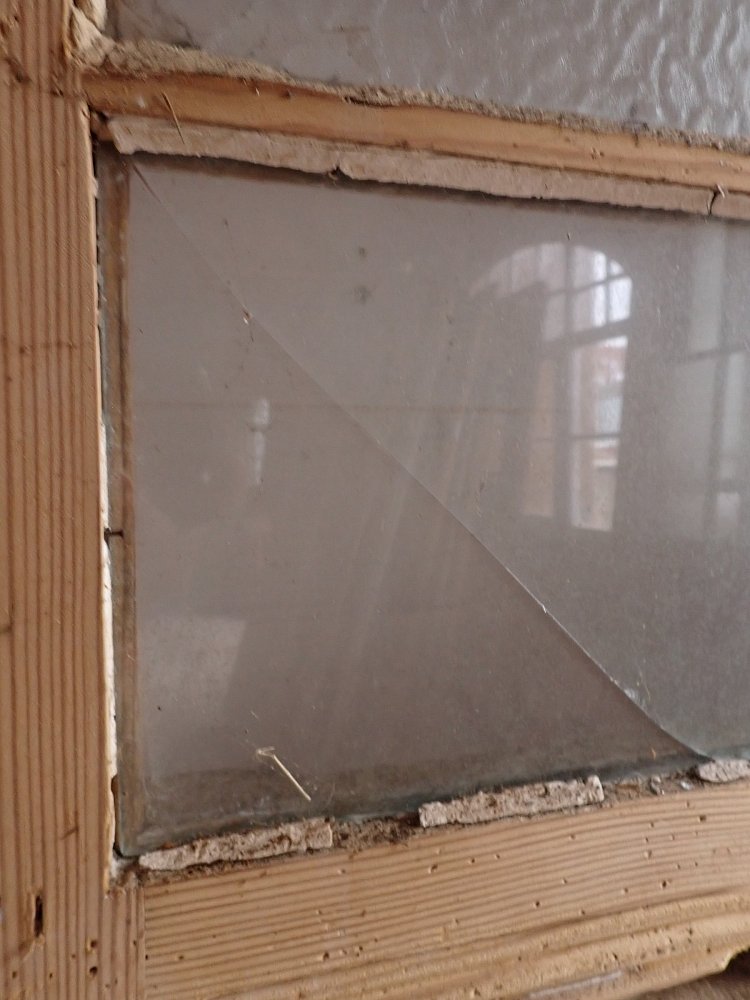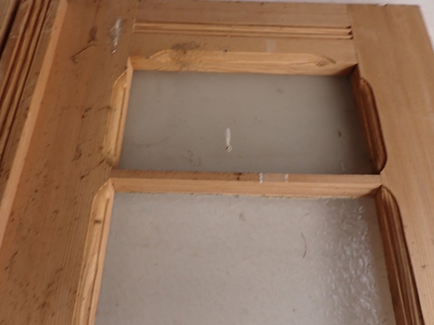 Auf der Innenseite sind die langen Holzleisten unten mittig etwas ausgebrochen. In einer Glasfüllung fehlt eine Strukturglasscheibe und eine kleine Klarglasscheibe hat einen Sprung.