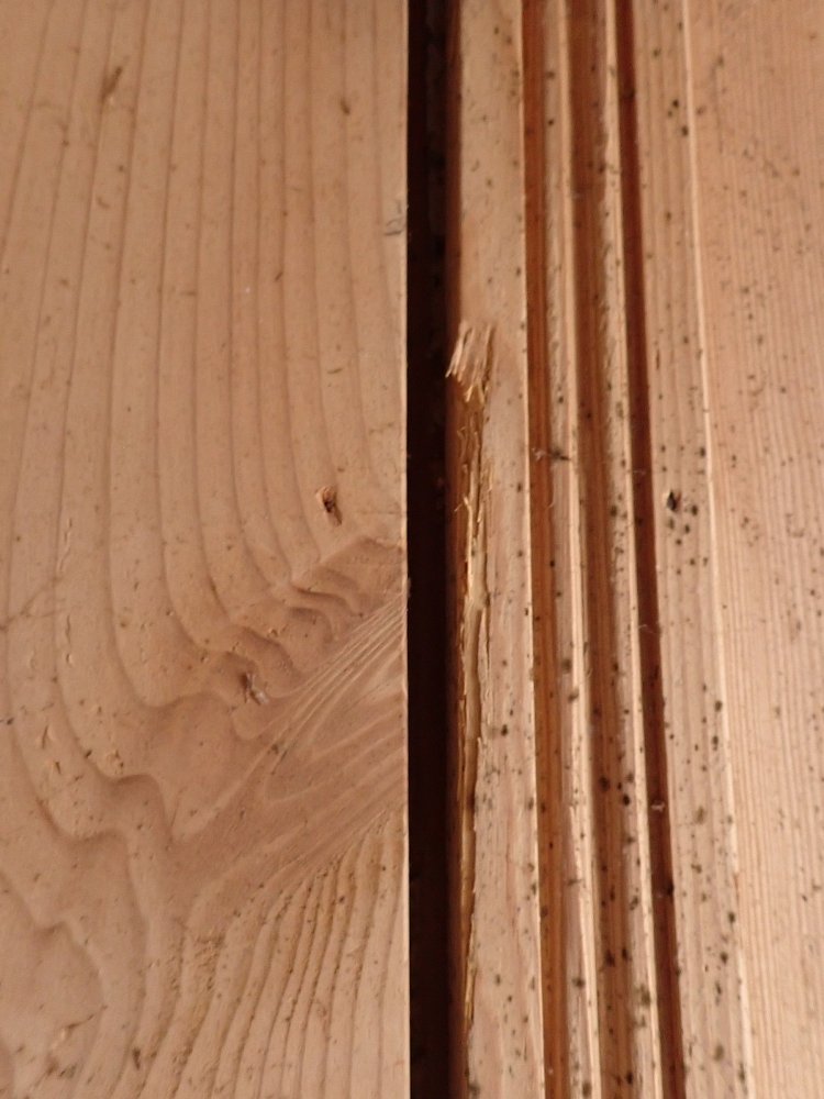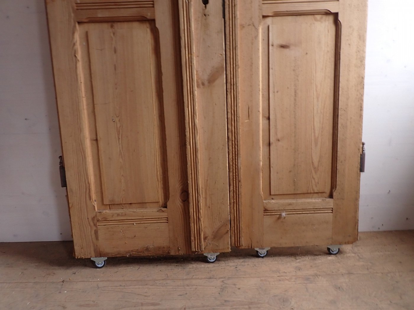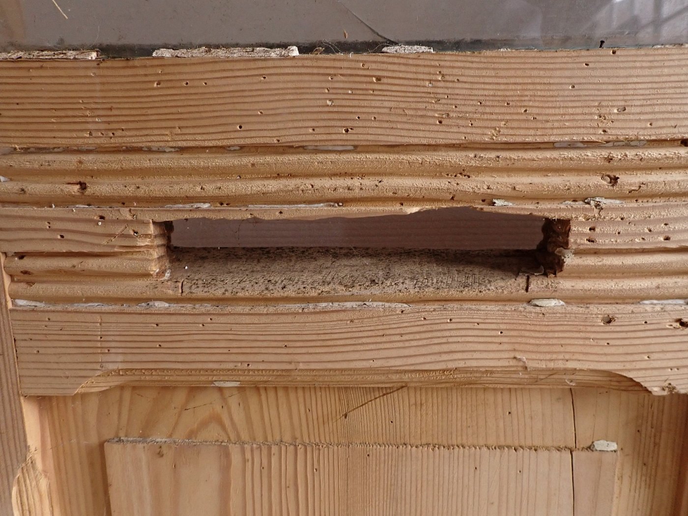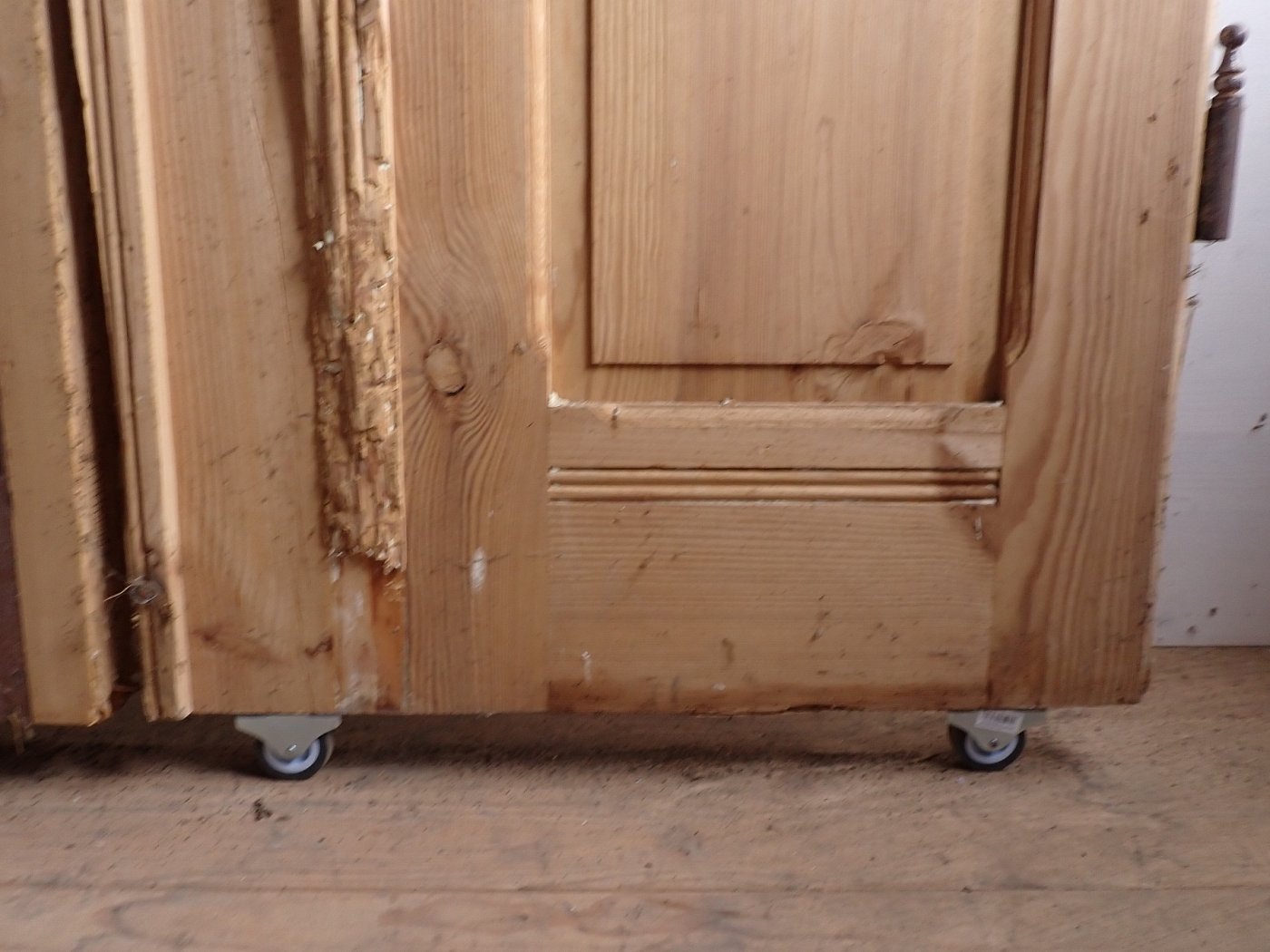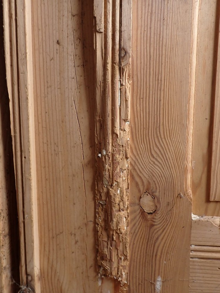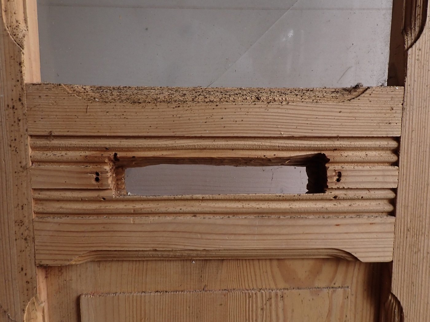 Auf der Innenseite sind die langen Holzleisten unten mittig etwas ausgebrochen. In einer Glasfüllung fehlt eine Strukturglasscheibe und eine kleine Klarglasscheibe hat einen Sprung.