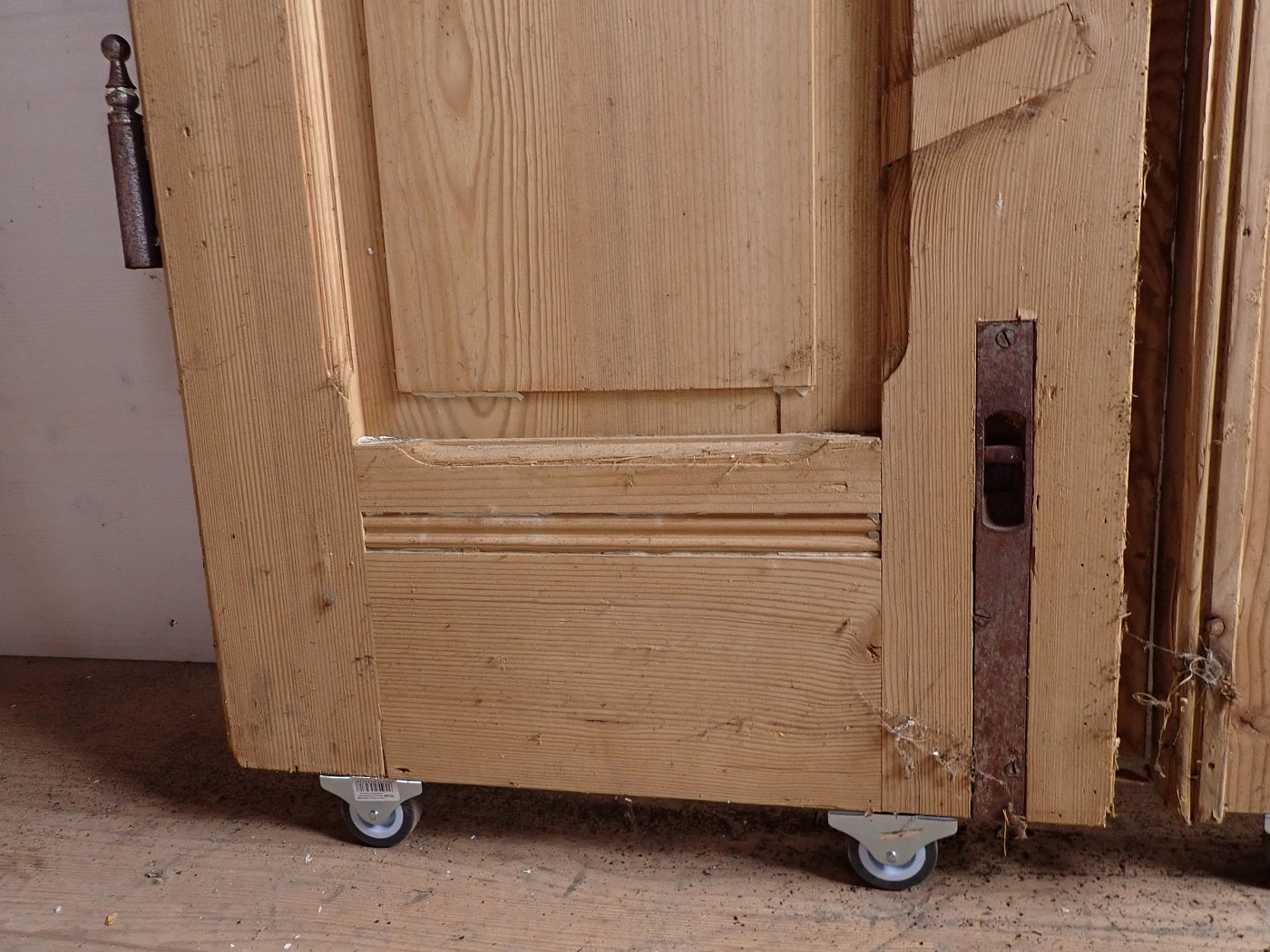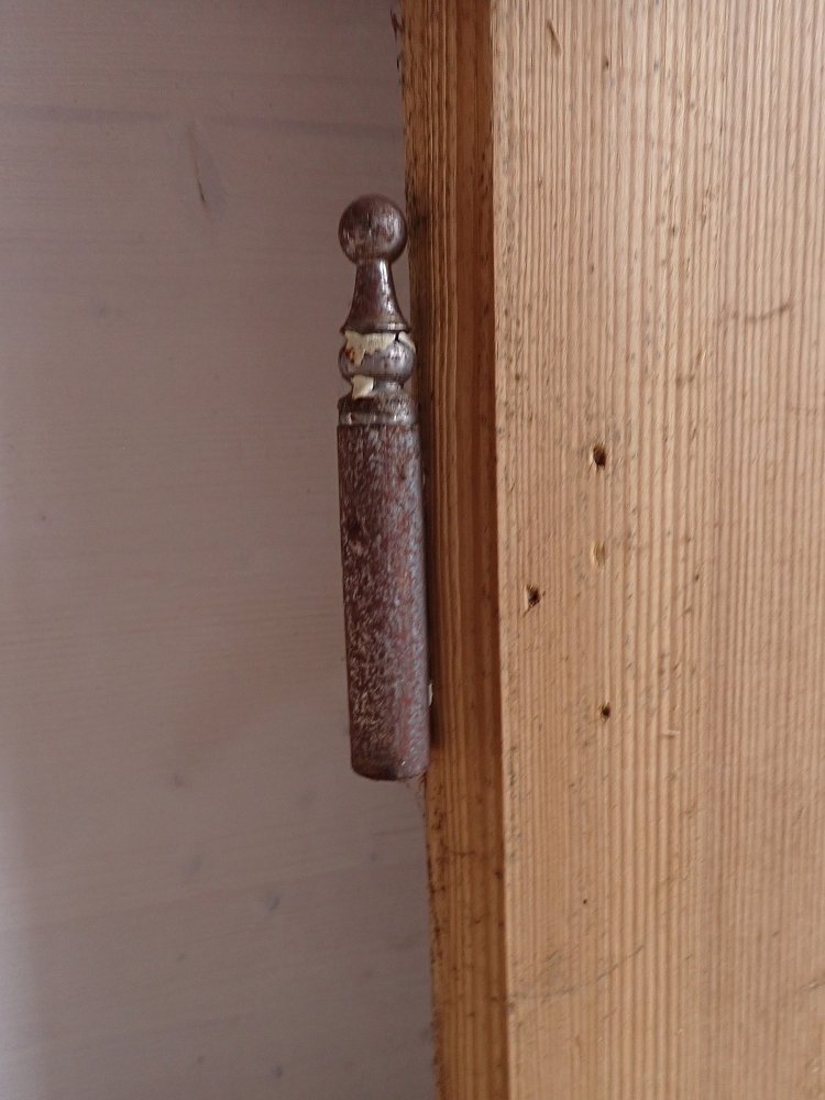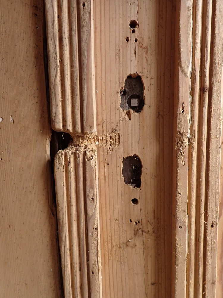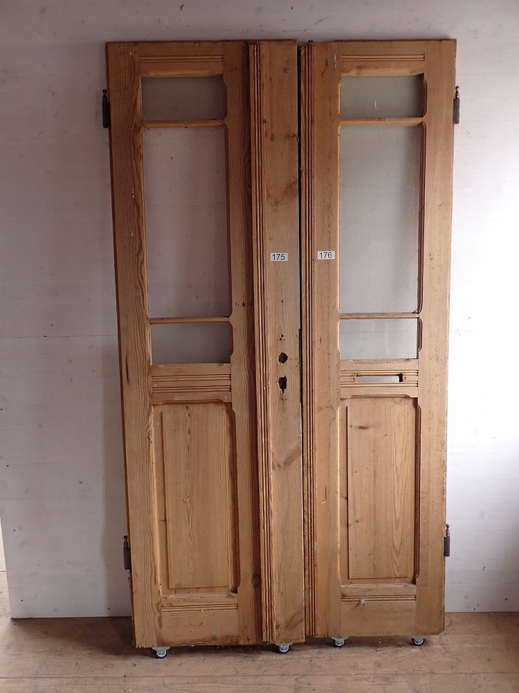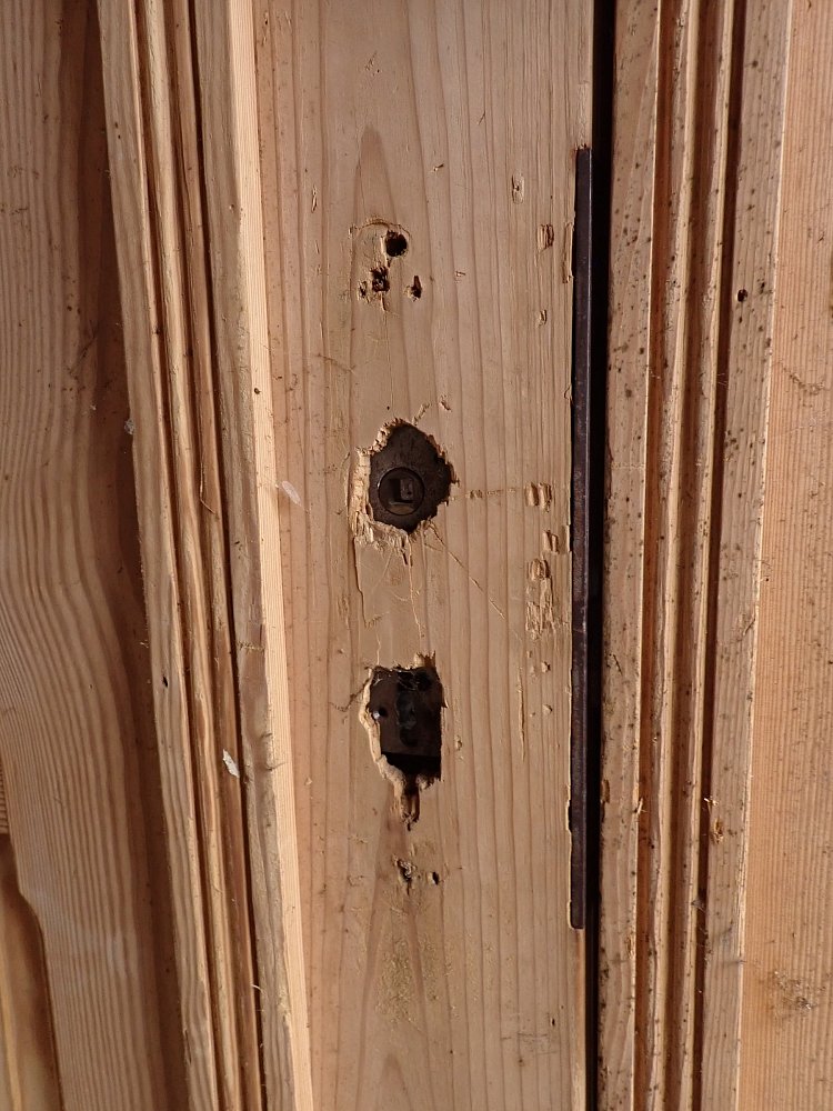 Die abgelaugte Wohnungstür hat zwei Holz und sechs Glasfüllungen, welche mit Leisten sprossenartig abgetrennt sind. Der feste Türflügel wird mit zwei Schubriegeln oben und unten Festgestellt. Auf der Außenseite sind die Füllungen am Rand hübsch verziert.