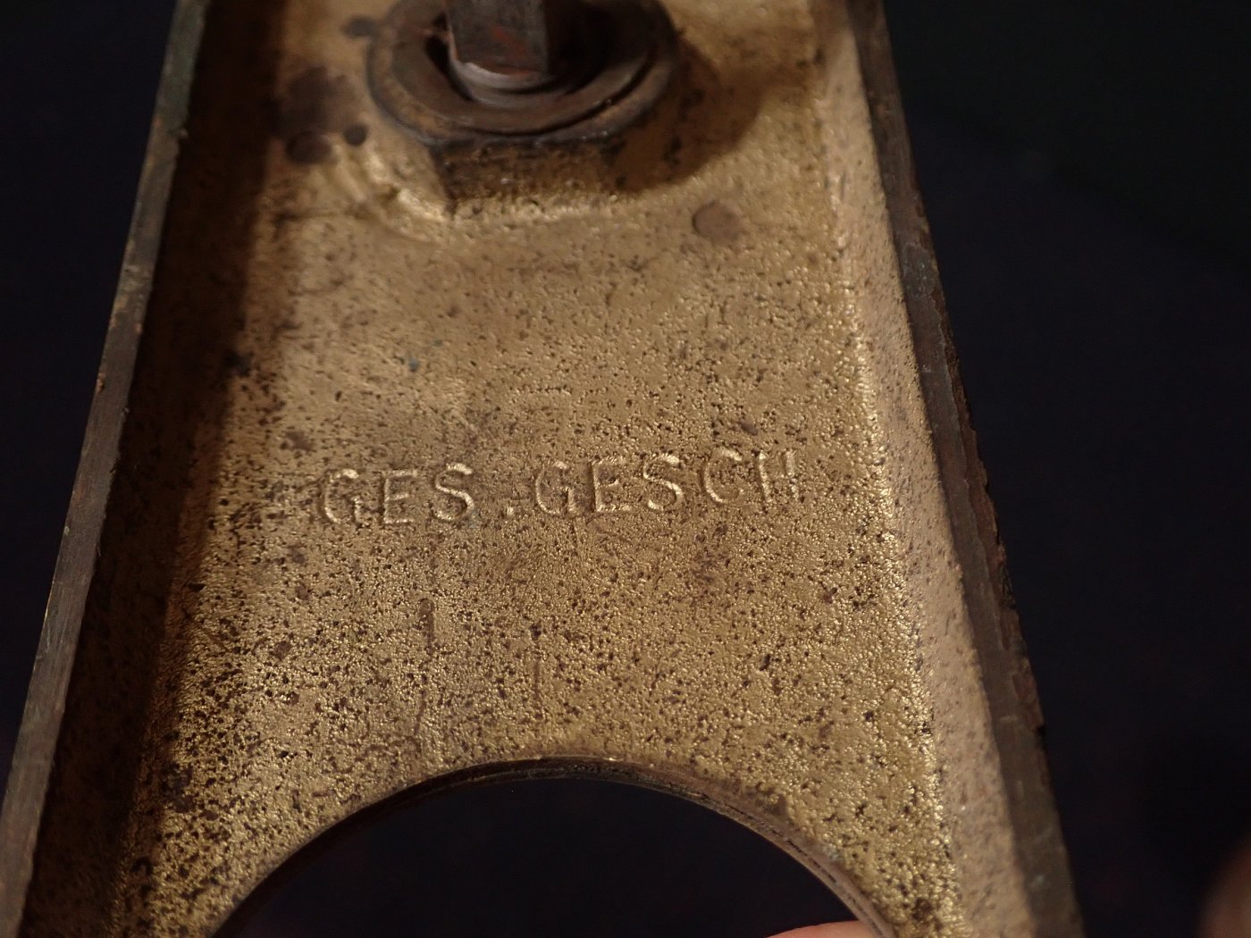 DetailansichtZieh und Stoßgriff aus Messing. Der Griff hat oben und unten jeweils zwei Schraublöcher zum befestigen des Griffes. Die Griffe sind leicht auf eine Seite gebogen.