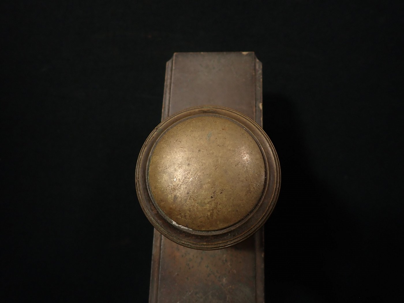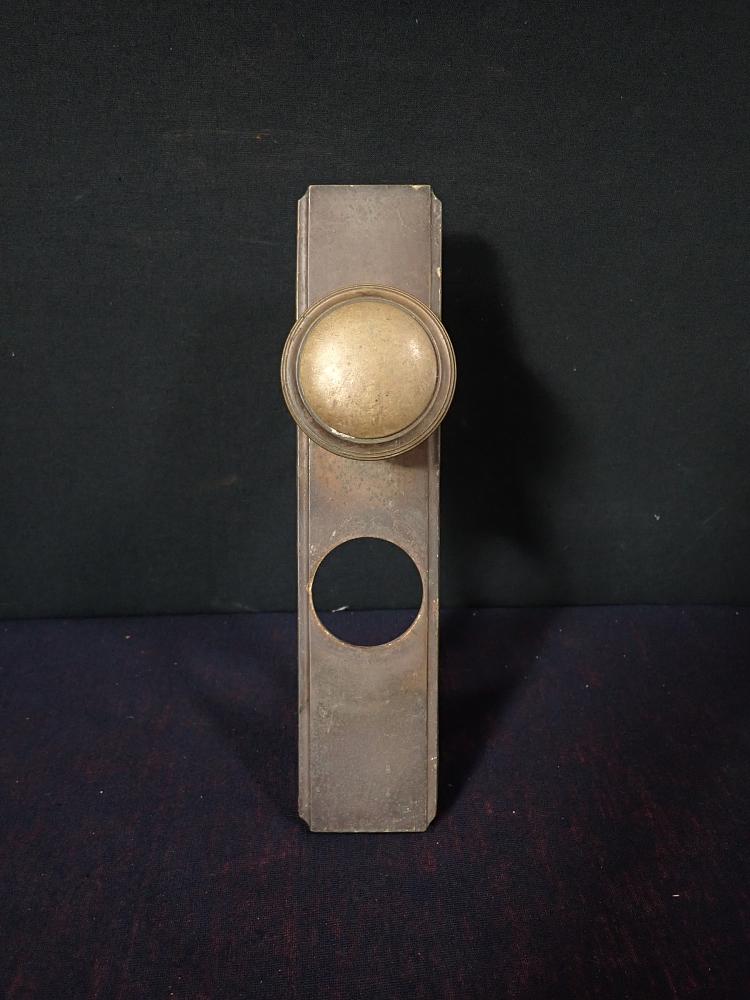 Großes Türschild mit rundem Knauf. Das rechteckige Messingschild ist mit einem massiven Knauf ausgestattet und hat eine große Aussparung für das Schloss.