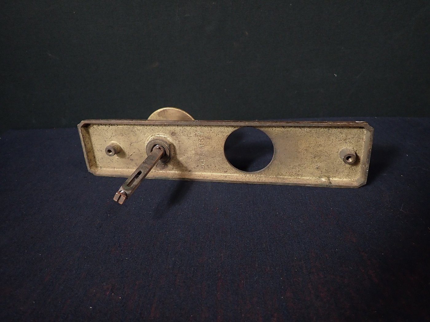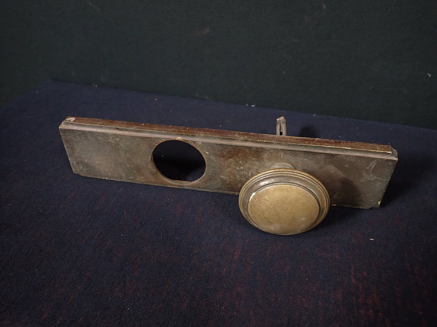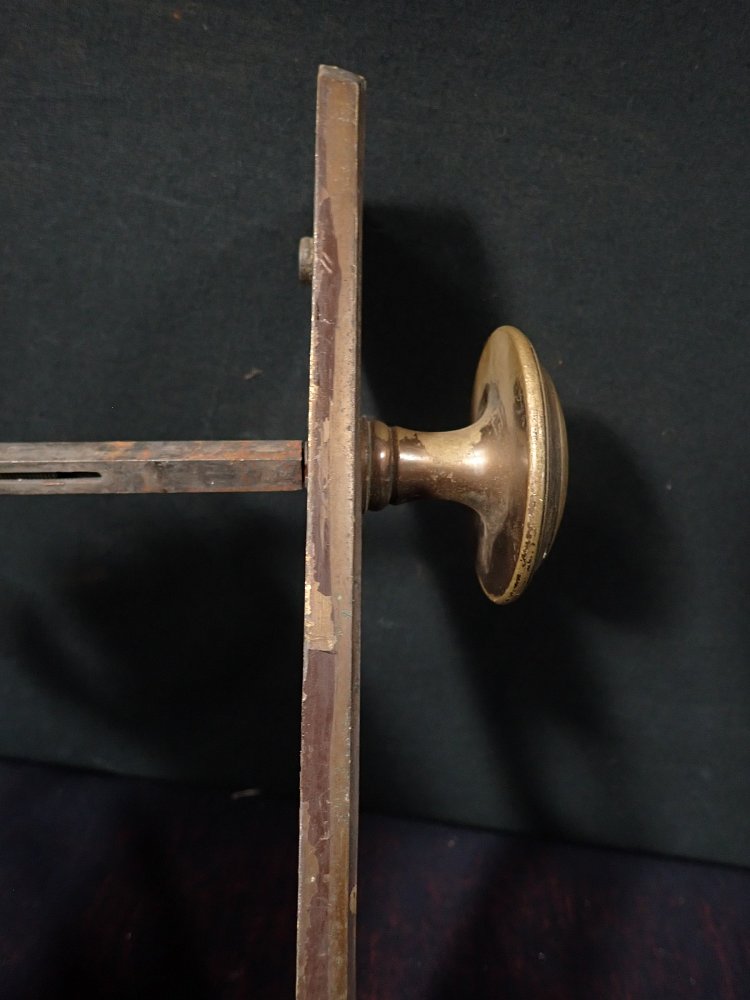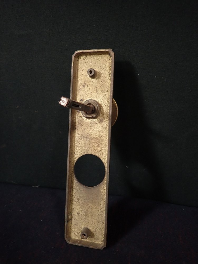 Das rechteckige Messingschild ist mit einem massiven Knauf ausgestattet und hat eine große Aussparung für das Schloss.