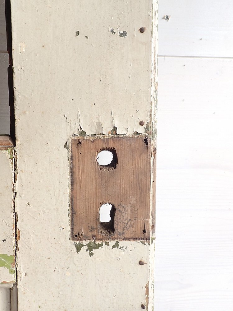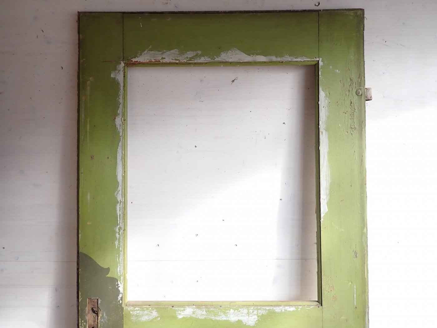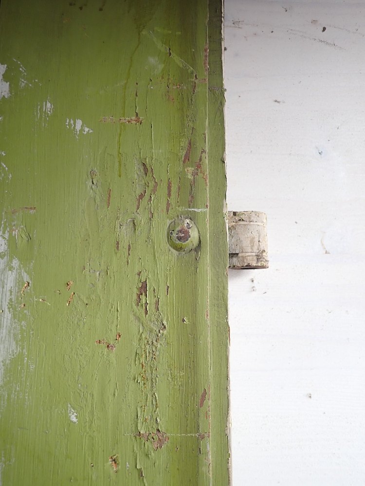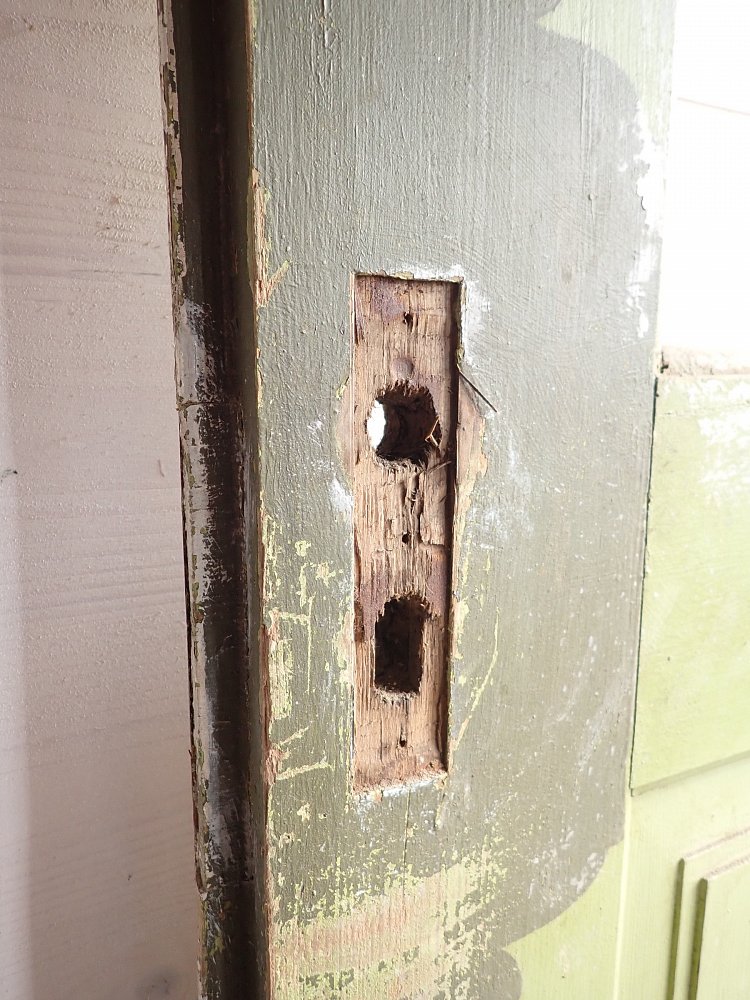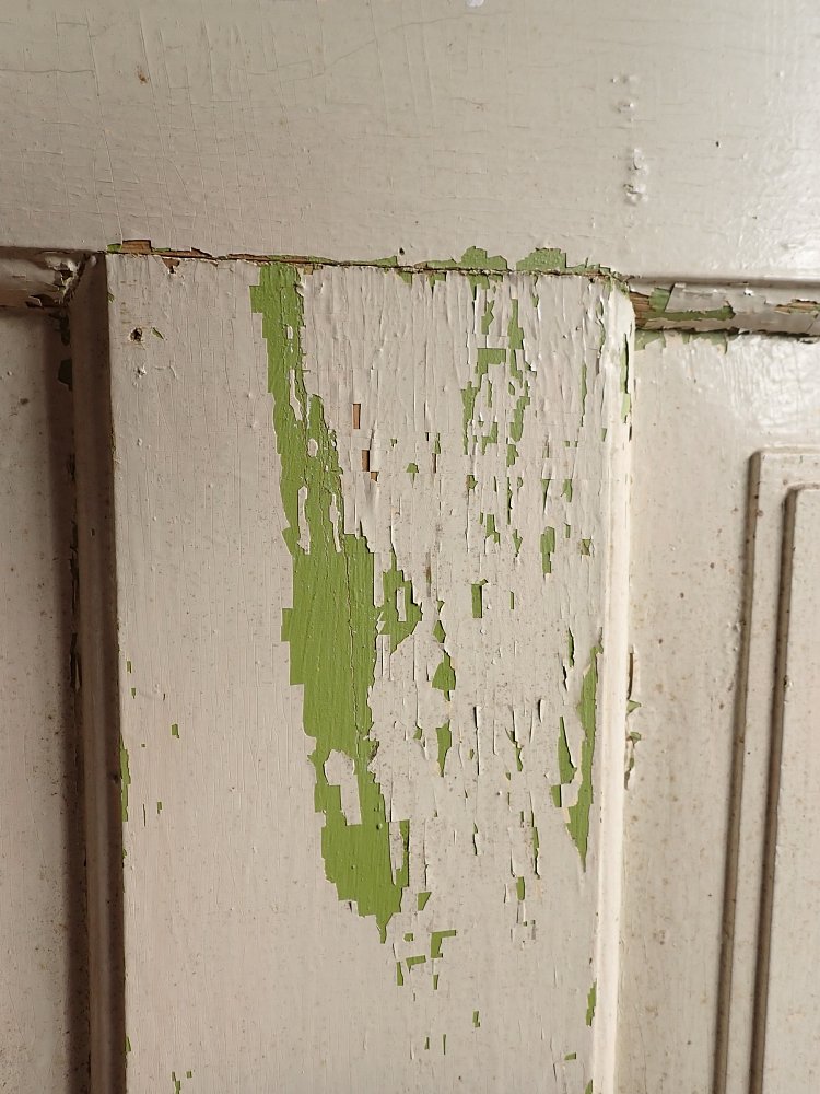 Insgesamt befindet sich die Tür in einem soliden Zustand. Der Lack blättert auf beiden Seiten ab, weshalb sich ein Ablaugen auch als Grundlage für die neue Gestaltung lohnen würde.