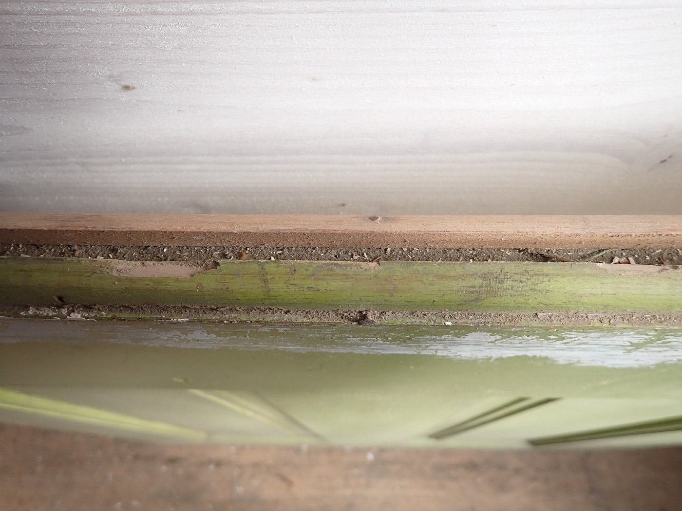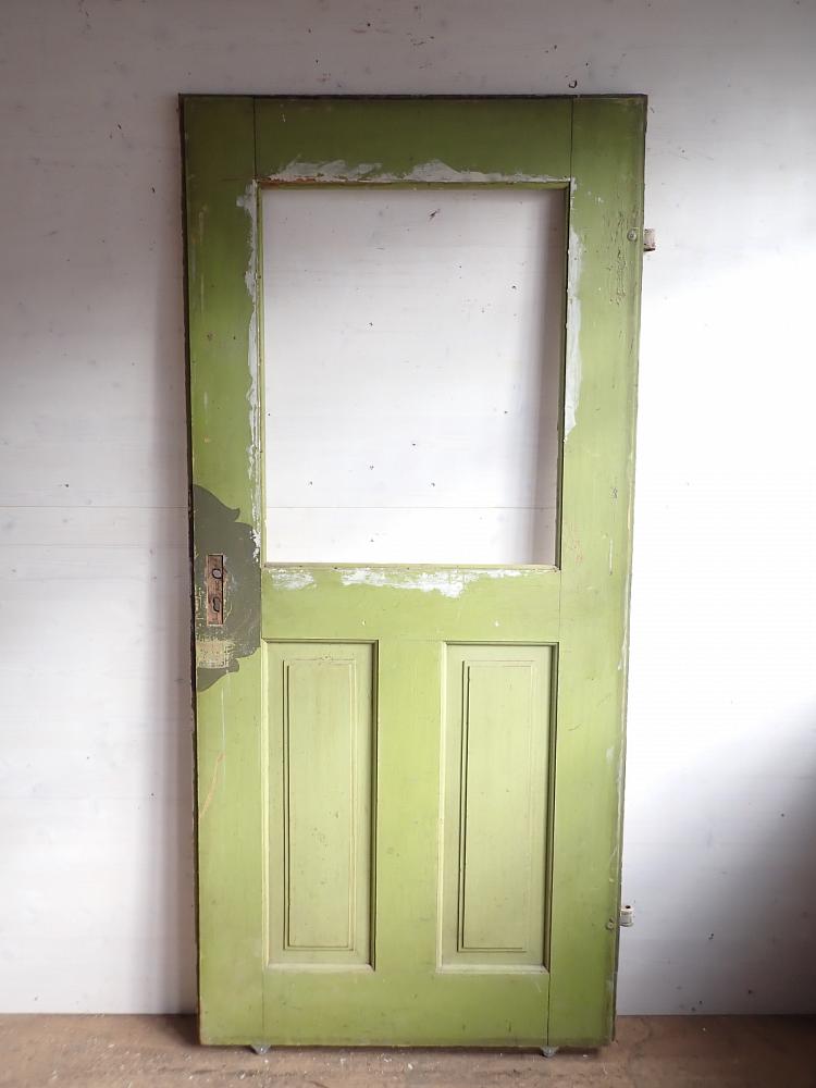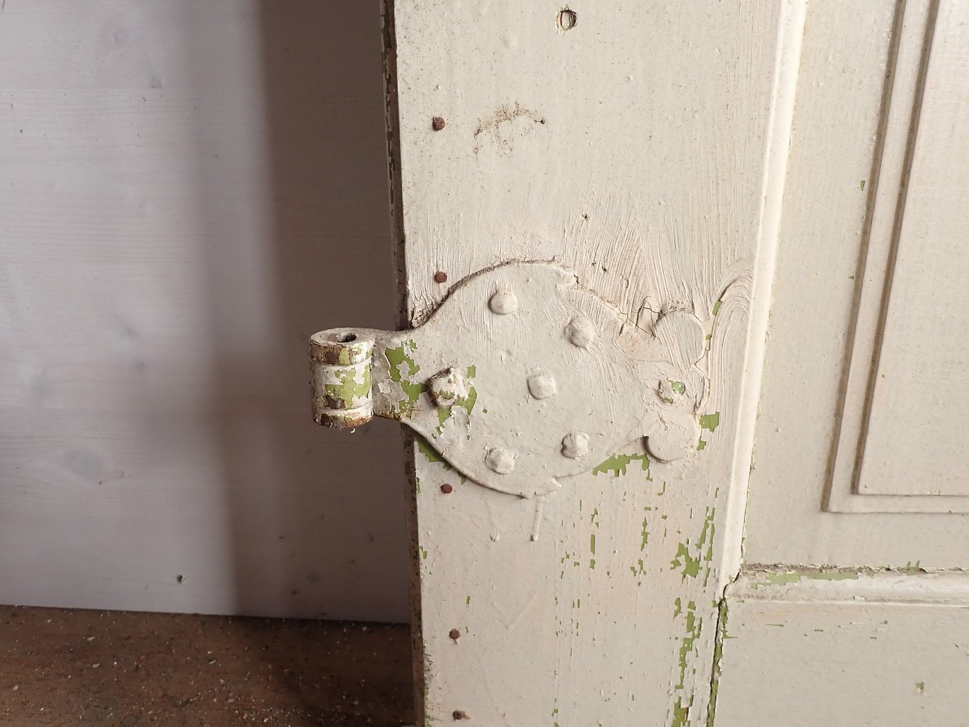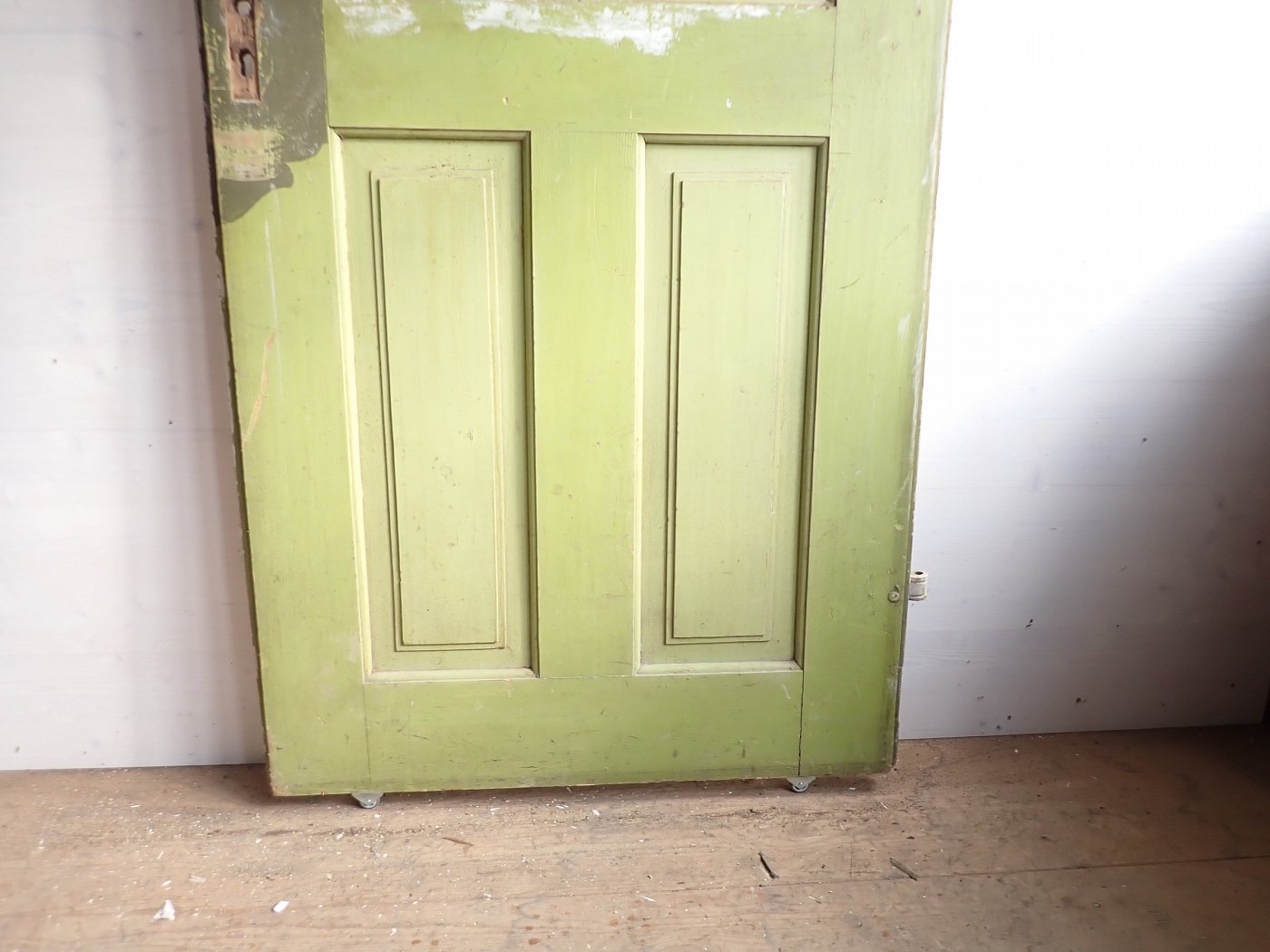 Insgesamt befindet sich die Tür in einem soliden Zustand. Der Lack blättert auf beiden Seiten ab, weshalb sich ein Ablaugen auch als Grundlage für die neue Gestaltung lohnen würde.