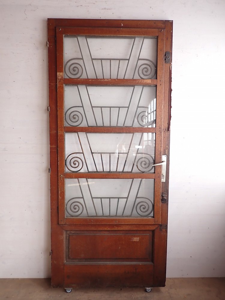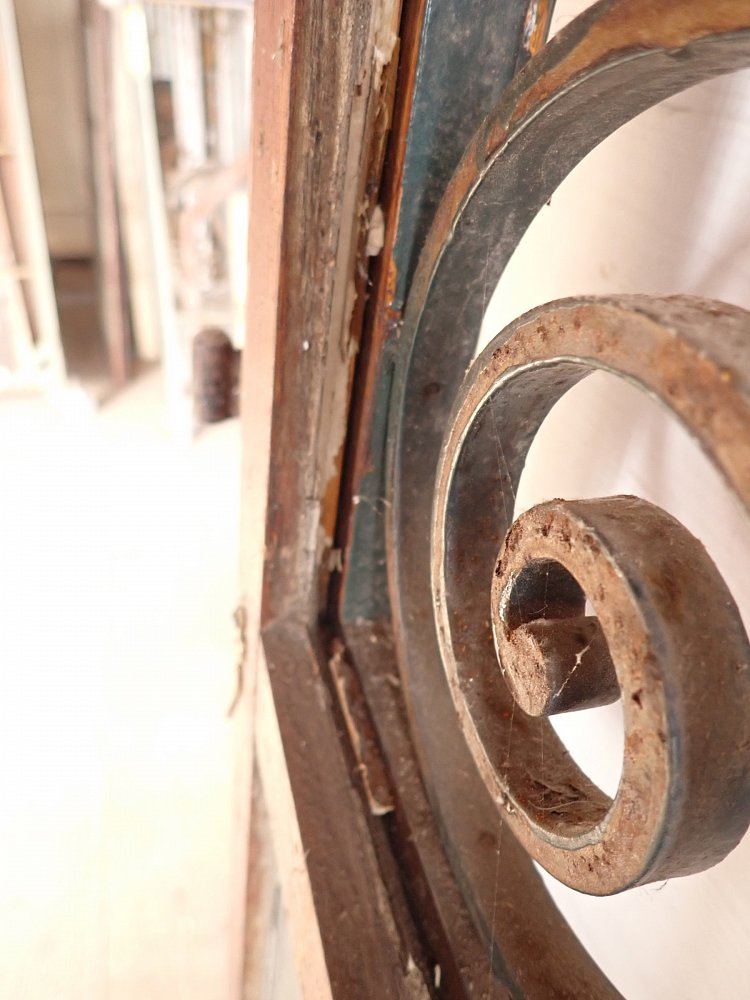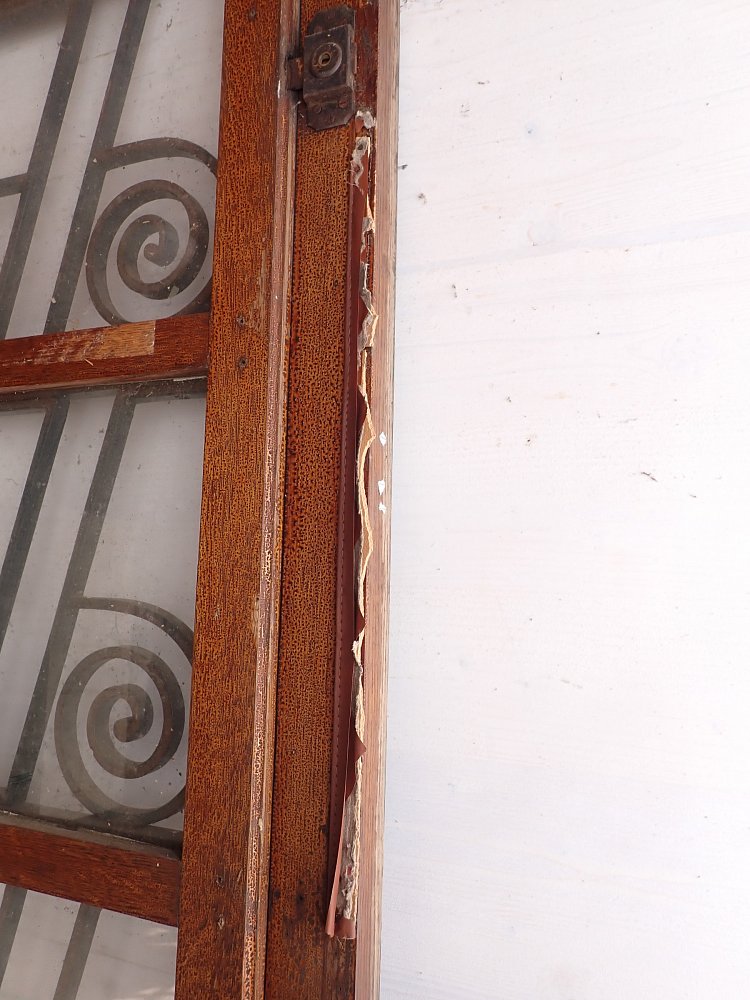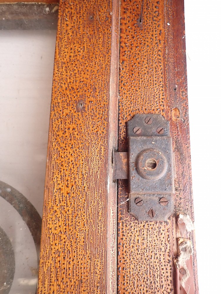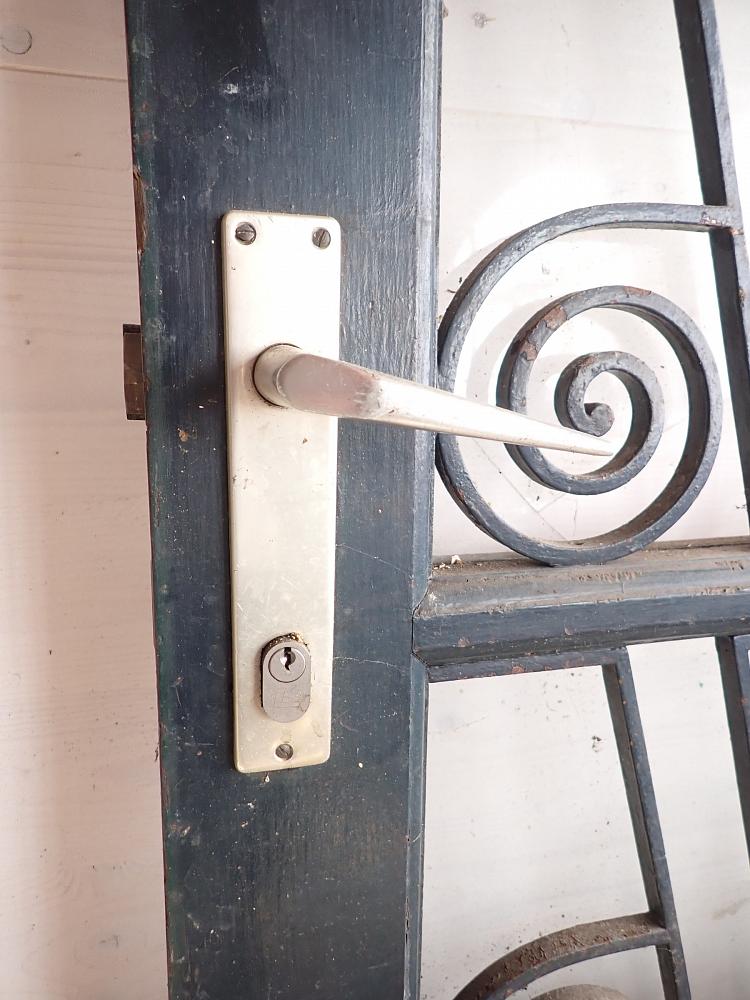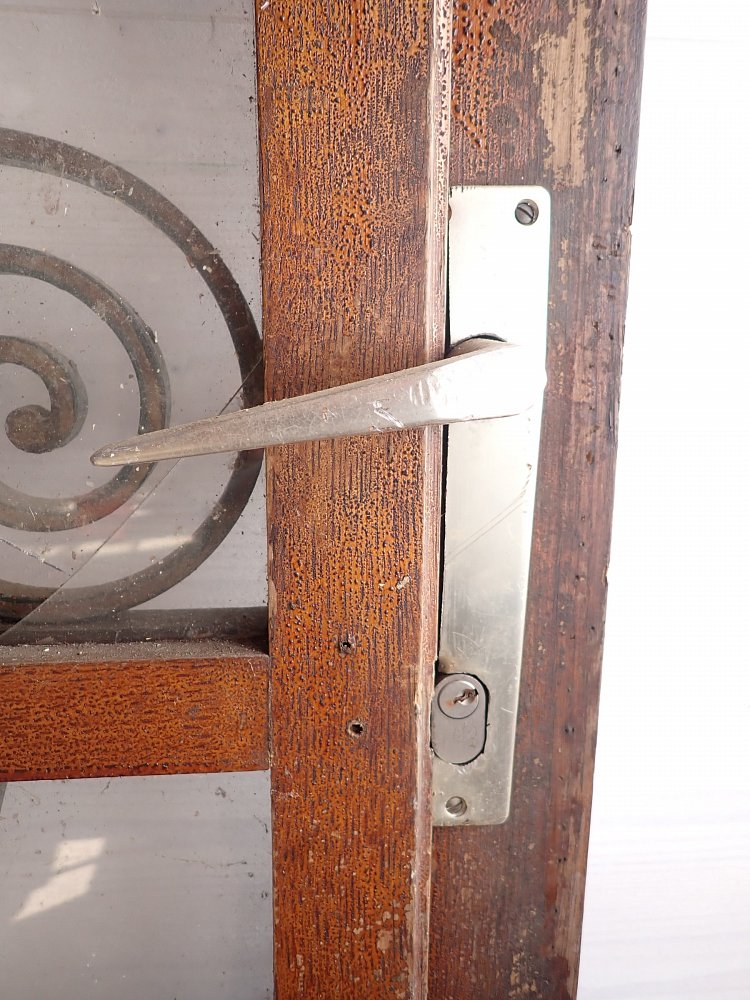 Die Zimmertür ist aus Eiche gefertigt und ist zu einem sehr großen Teil mit einer großen Lichtöffnung als Fenster und mit schmiedeeisernen Gittern gestaltet. Das Fenster kann geöffnet werden, allerdings hat der Vorbesitzer eine Türklinke montiert, die das Öffnen verhindert. Aber mit einer anderen Klinke, lässt sich das Problem bestimmt beheben. Eine der Scheiben ist bereits gebrochen.