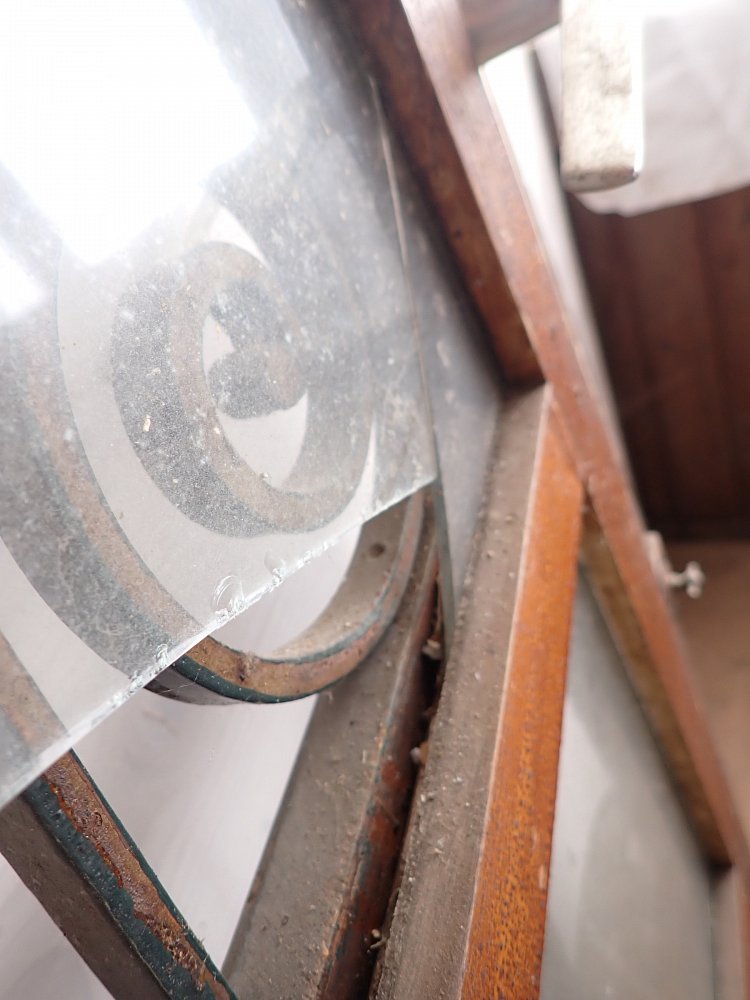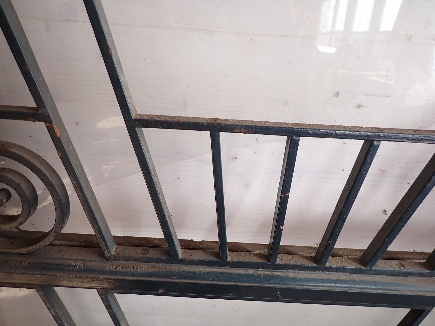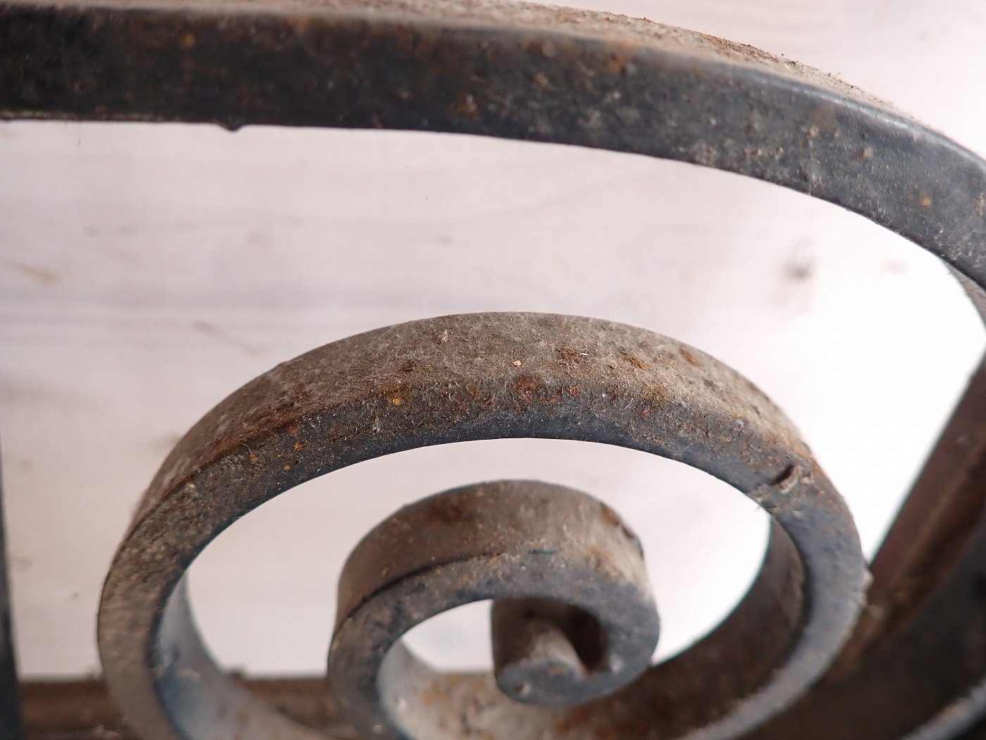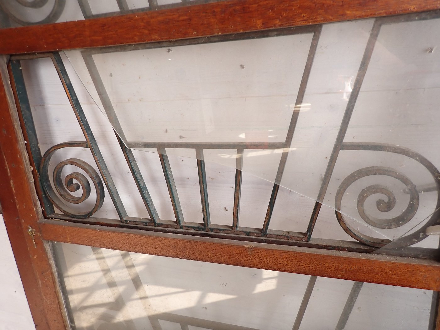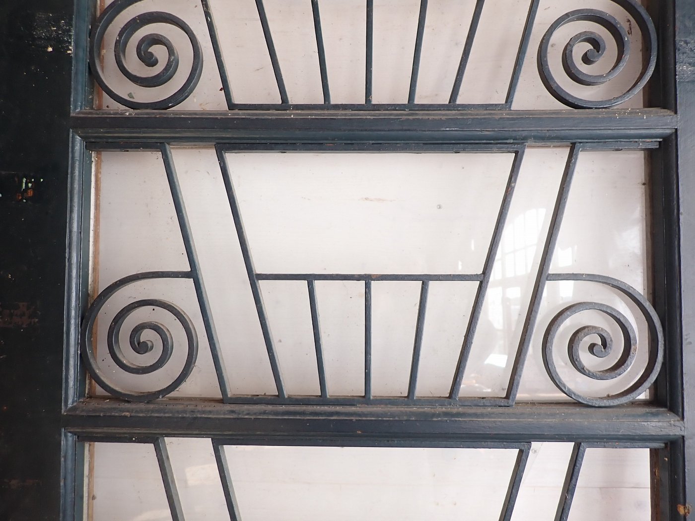 Die Zimmertür ist aus Eiche gefertigt und ist zu einem sehr großen Teil mit einer großen Lichtöffnung als Fenster und mit schmiedeeisernen Gittern gestaltet. Das Fenster kann geöffnet werden, allerdings hat der Vorbesitzer eine Türklinke montiert, die das Öffnen verhindert. Aber mit einer anderen Klinke, lässt sich das Problem bestimmt beheben. Eine der Scheiben ist bereits gebrochen.