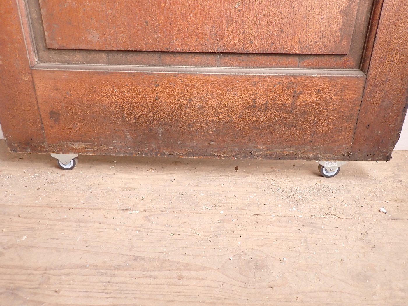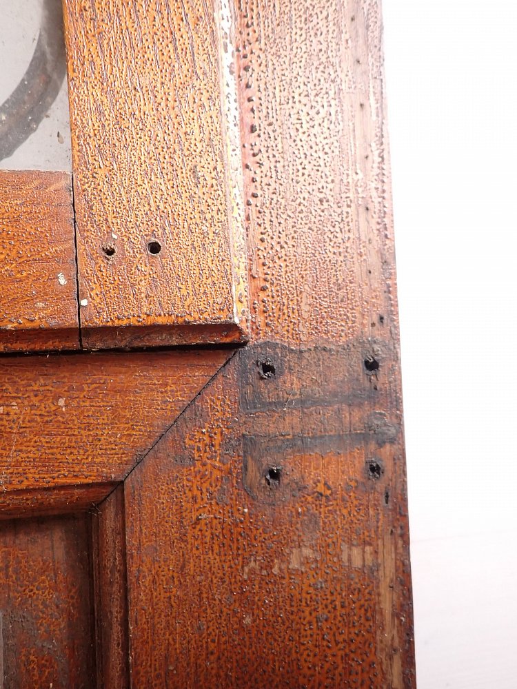 Der Lack blättert an manchen Stellen ab, was sich mit Ablaugen der Tür beheben lässt. Es sind Spuren eines Wurmbefalls zu erkennen.