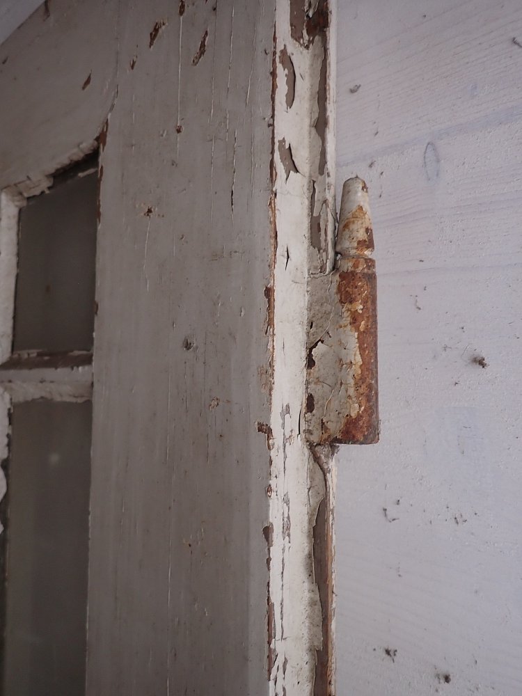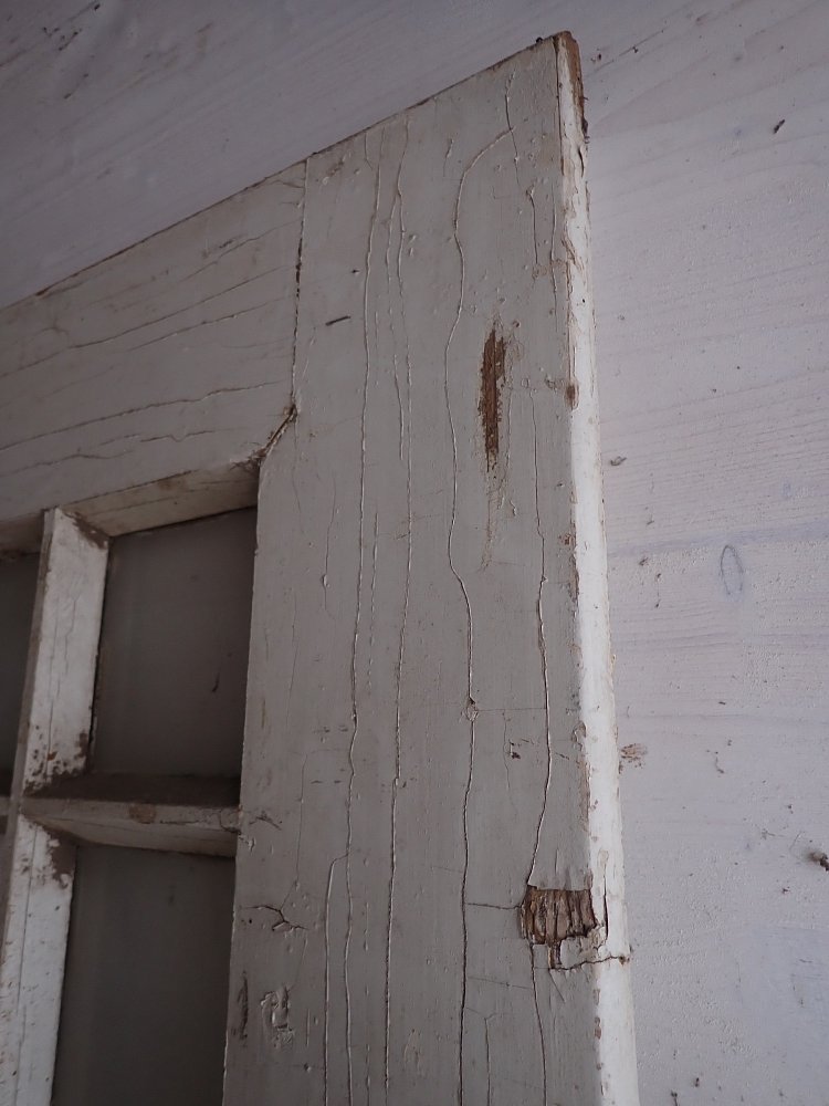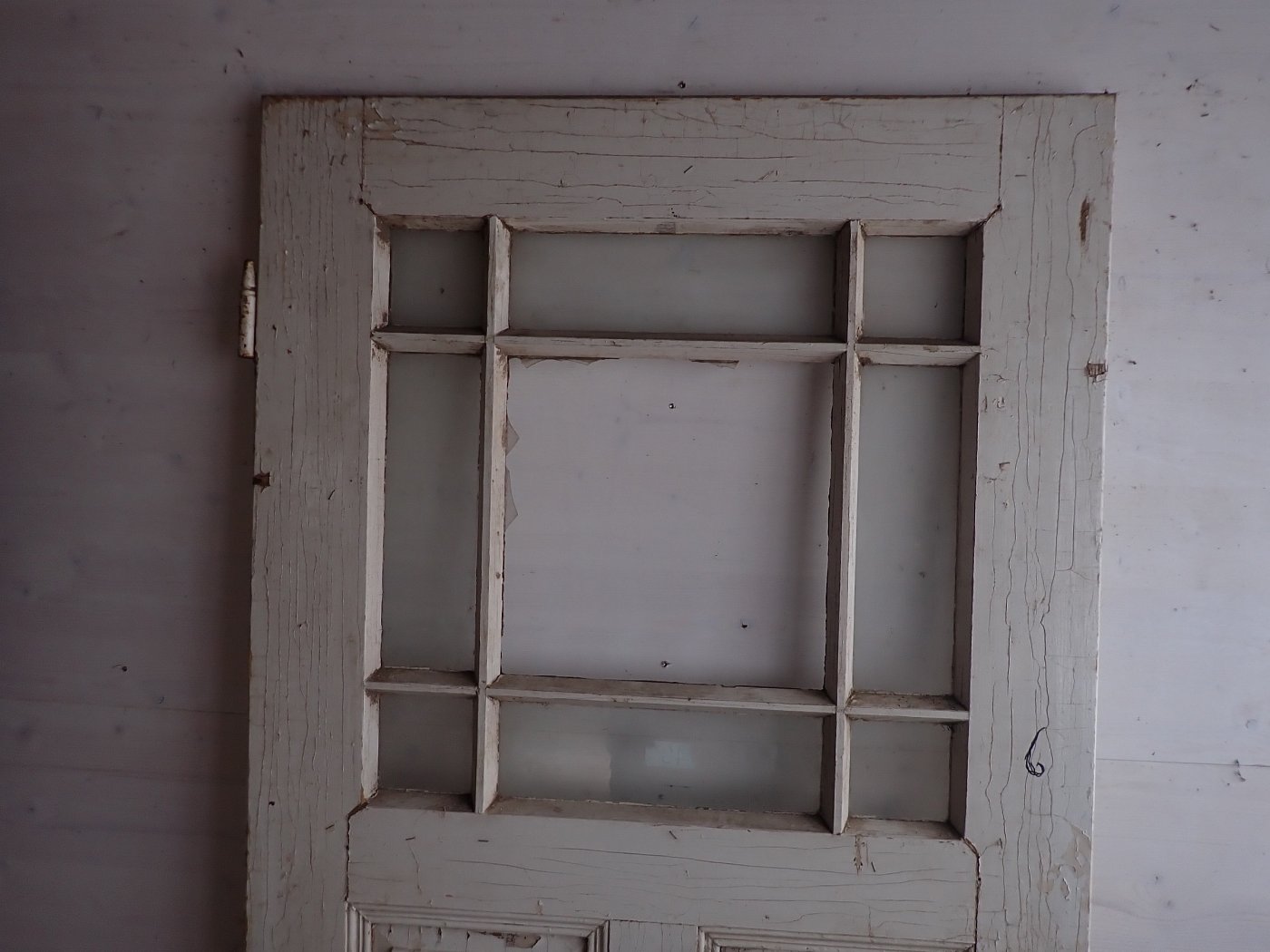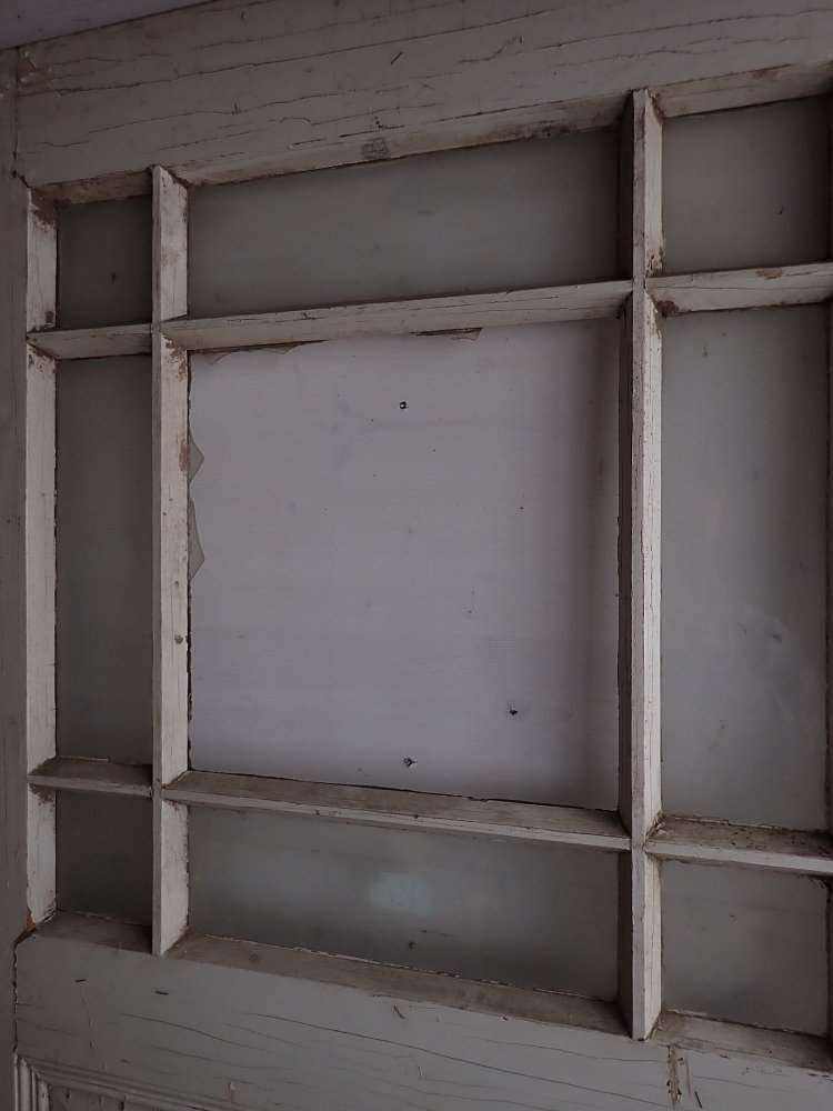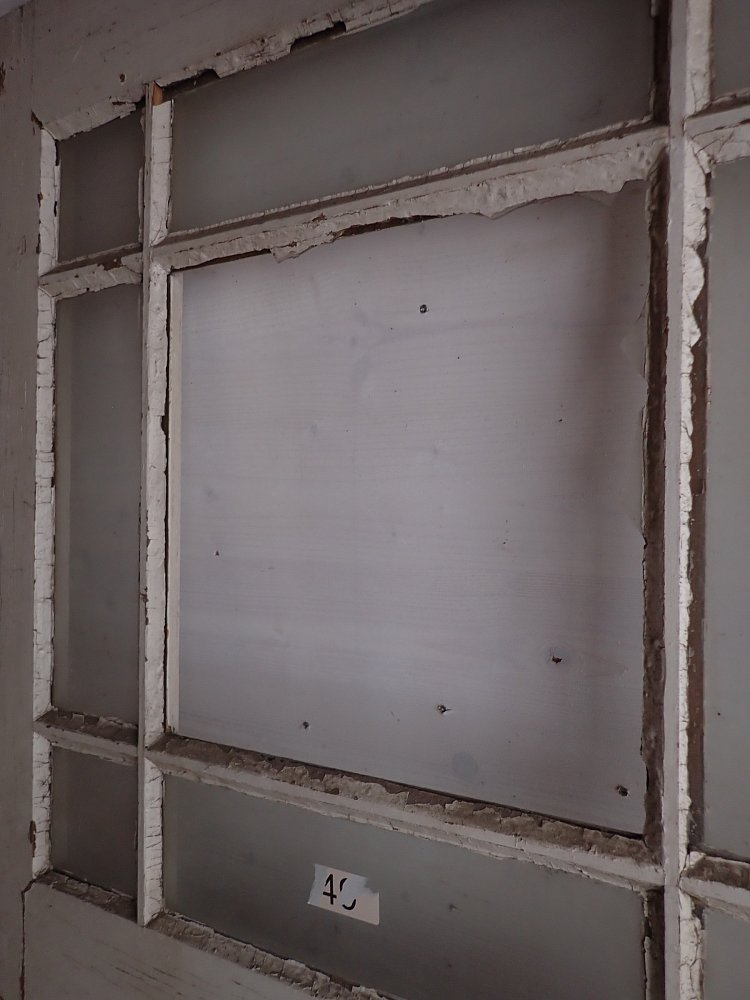 Zimmertür mit 3 Holzfüllungen und 8 Glasfüllungen, welche mit Holzleisten abgetrennt sind und aussehen wie ein Sprossenfenster. Die große mittlere Scheibe ist nicht vorhanden und müsste neu eingesetzt werden. Ebenfalls müsste vor dem Einbau ein Türschloss mit dem passenden Türdrückern angebracht werden.