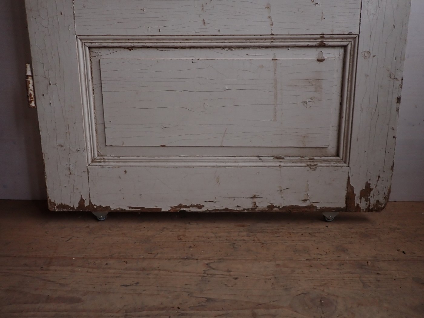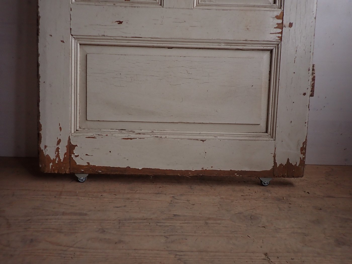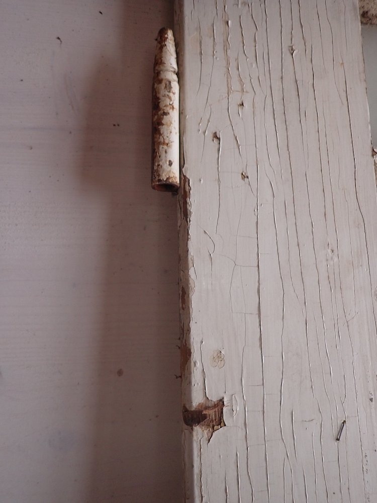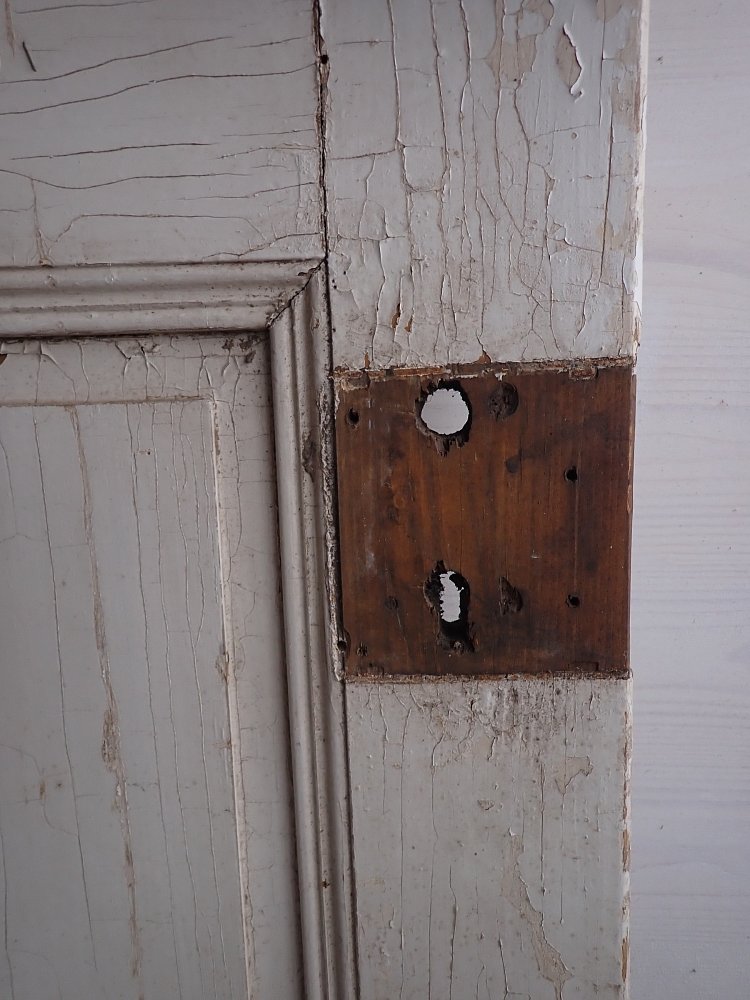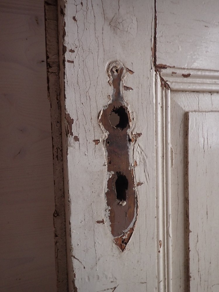 Stellenweiße ist der weiße Lack abgeblättert und es sind Gebrauchsspuren an der Tür zu erkennen.
