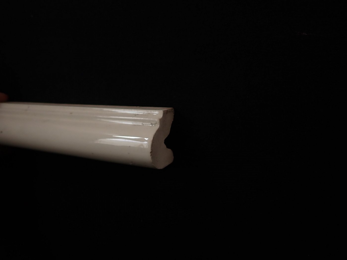 Cremeweiße Fließenbordüre. Die schmalen Keramikfliesen sind mit einem schönen Profil gearbeitet und dienen zum dekorativen Abschluss eines Fliesenspiegels an...